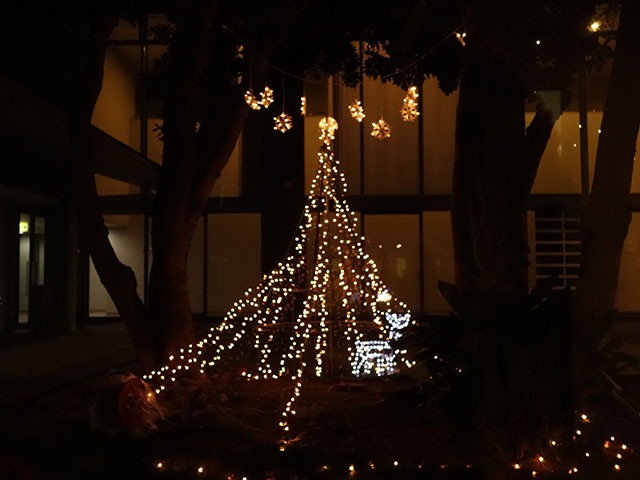 公演本番まであと1週間を切りました。会場の延岡総合文化センターの中庭にクリスマスの飾りつけがされています。