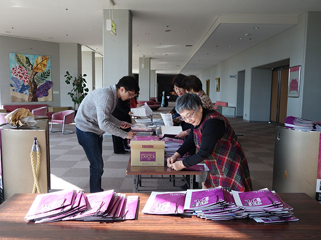 公演の18時30分を前に団員の集合時間は13時30分。それを前にしてあつまったメンバーで当日の配布資料の準備です。