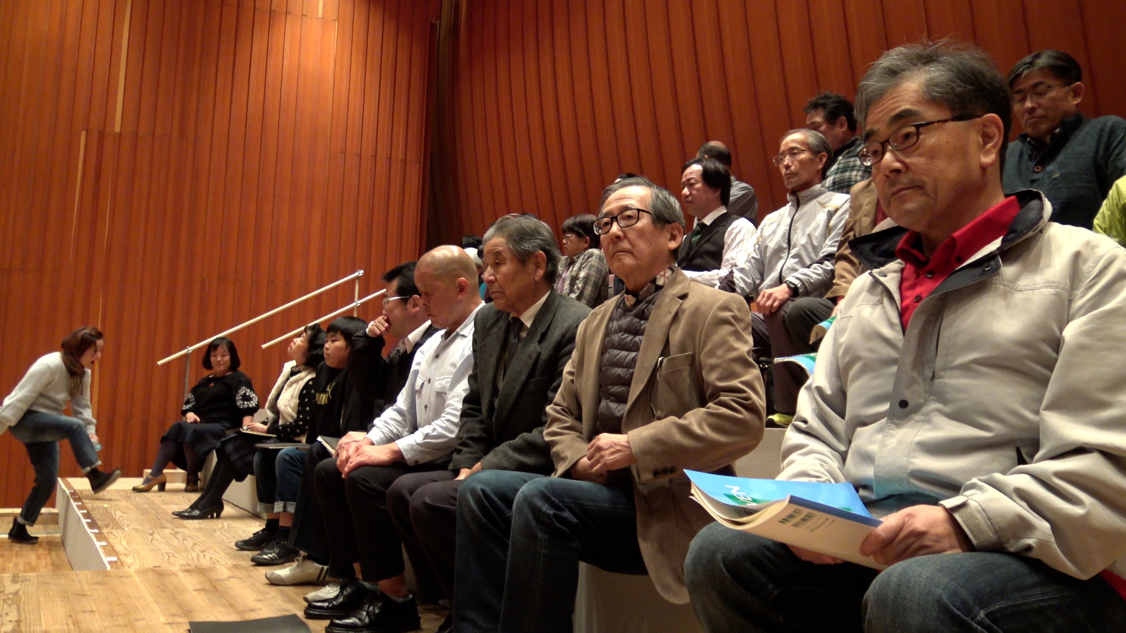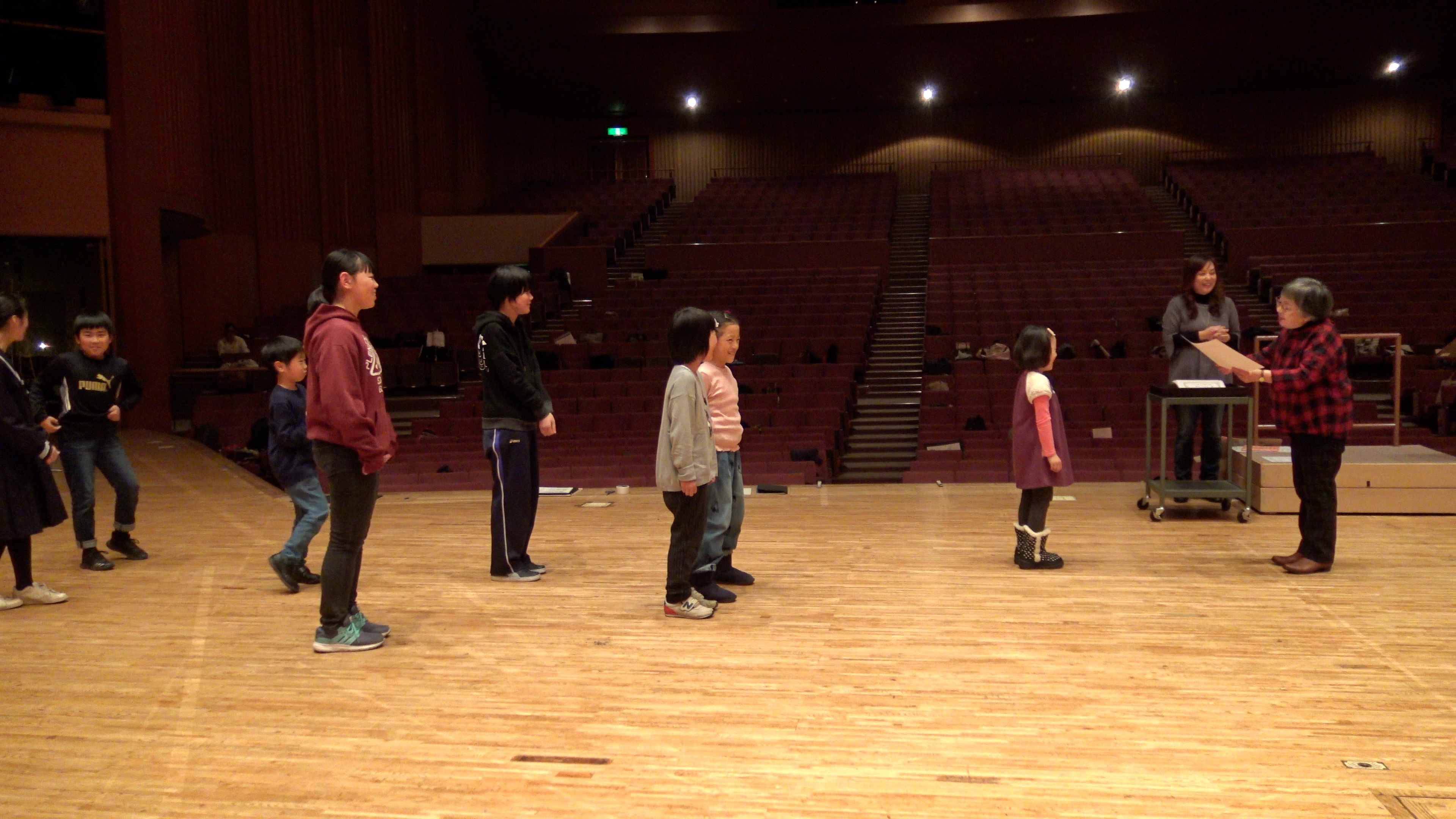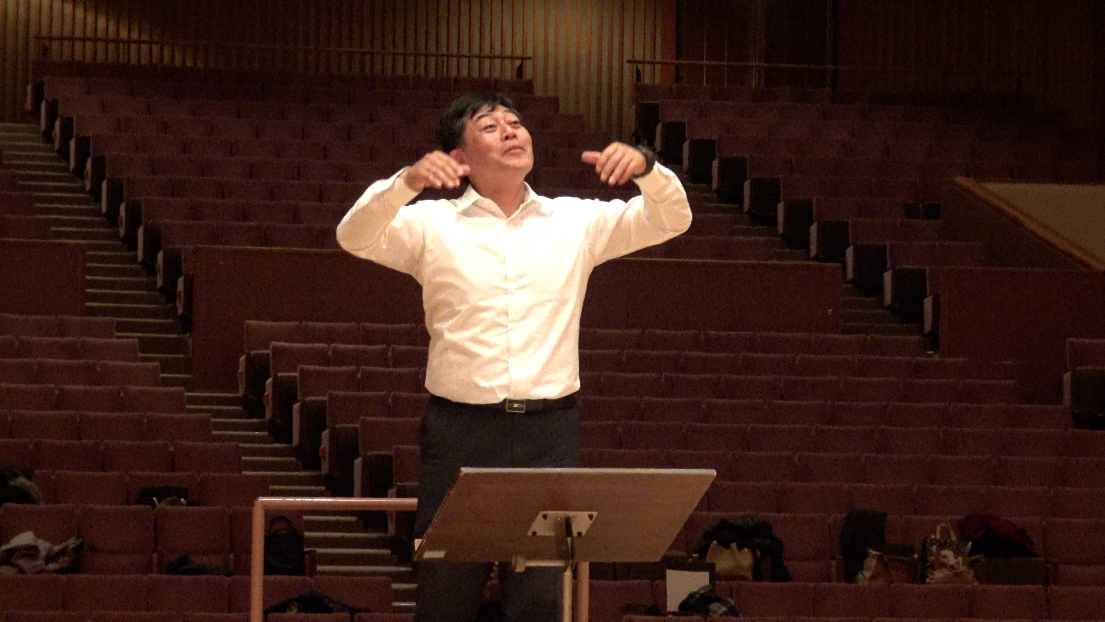 演奏会場の大ホールにはひな壇も組まれ、団員は翌日の立ち位置を確認。響きも確認しつつ発声練習です。