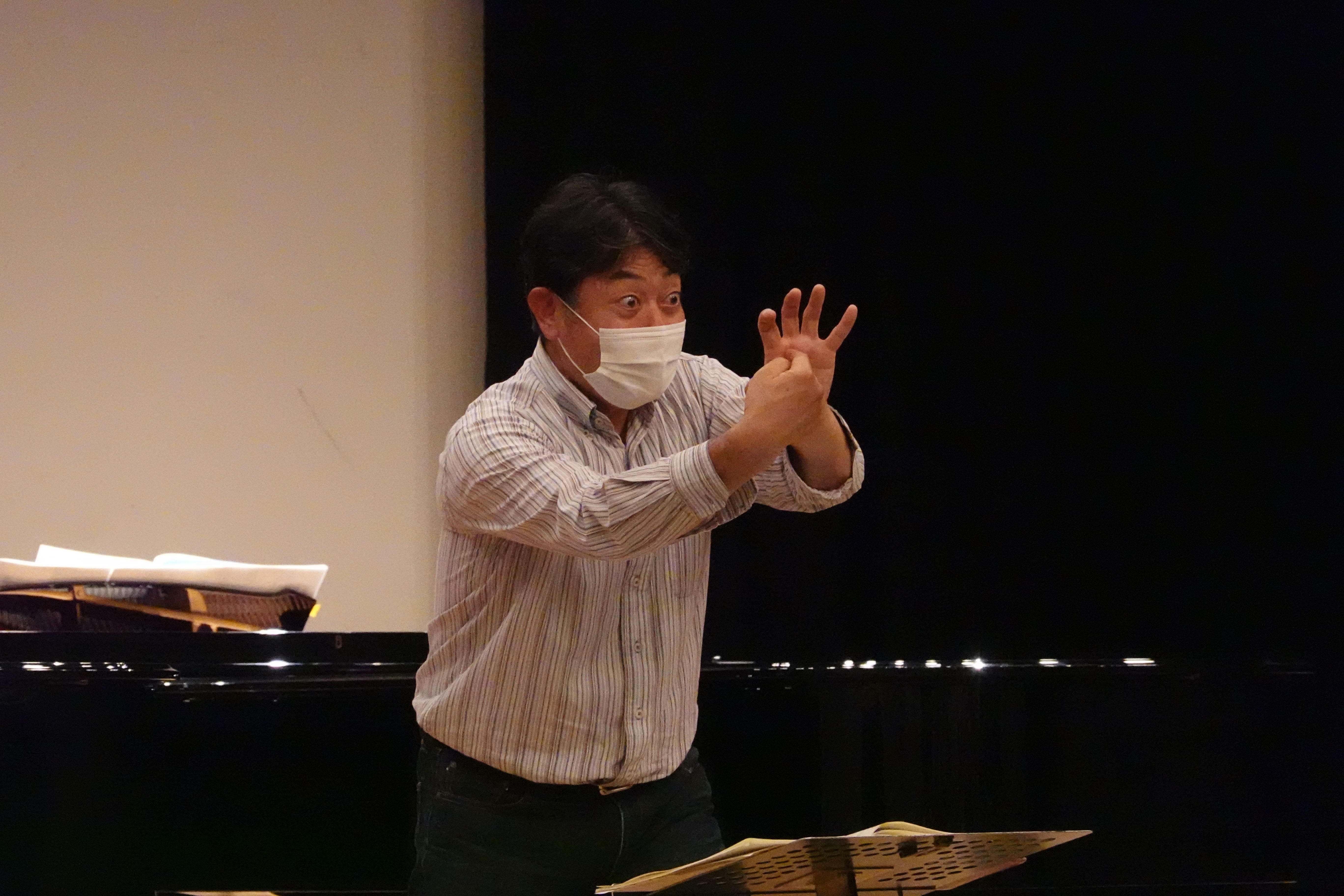 柳田先生の全体指導、ソロの部分を歌いながら指揮。そして指導と忙しい。