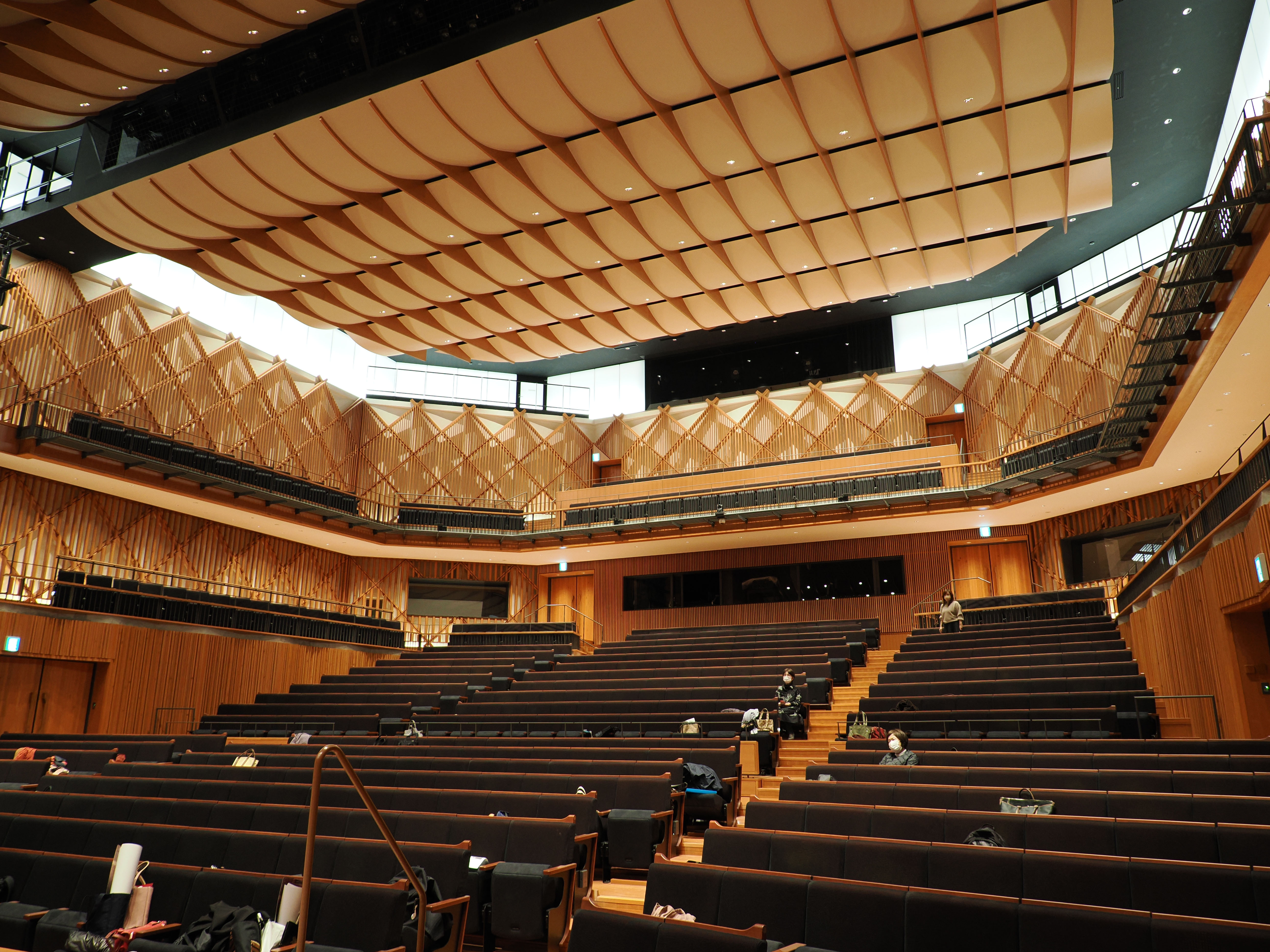 ホール内は木の香りが漂い、客席はご覧の通り。我々は、まだ誰も踏み入れていない檜舞台に足を踏み入る最初の来訪者となりました。