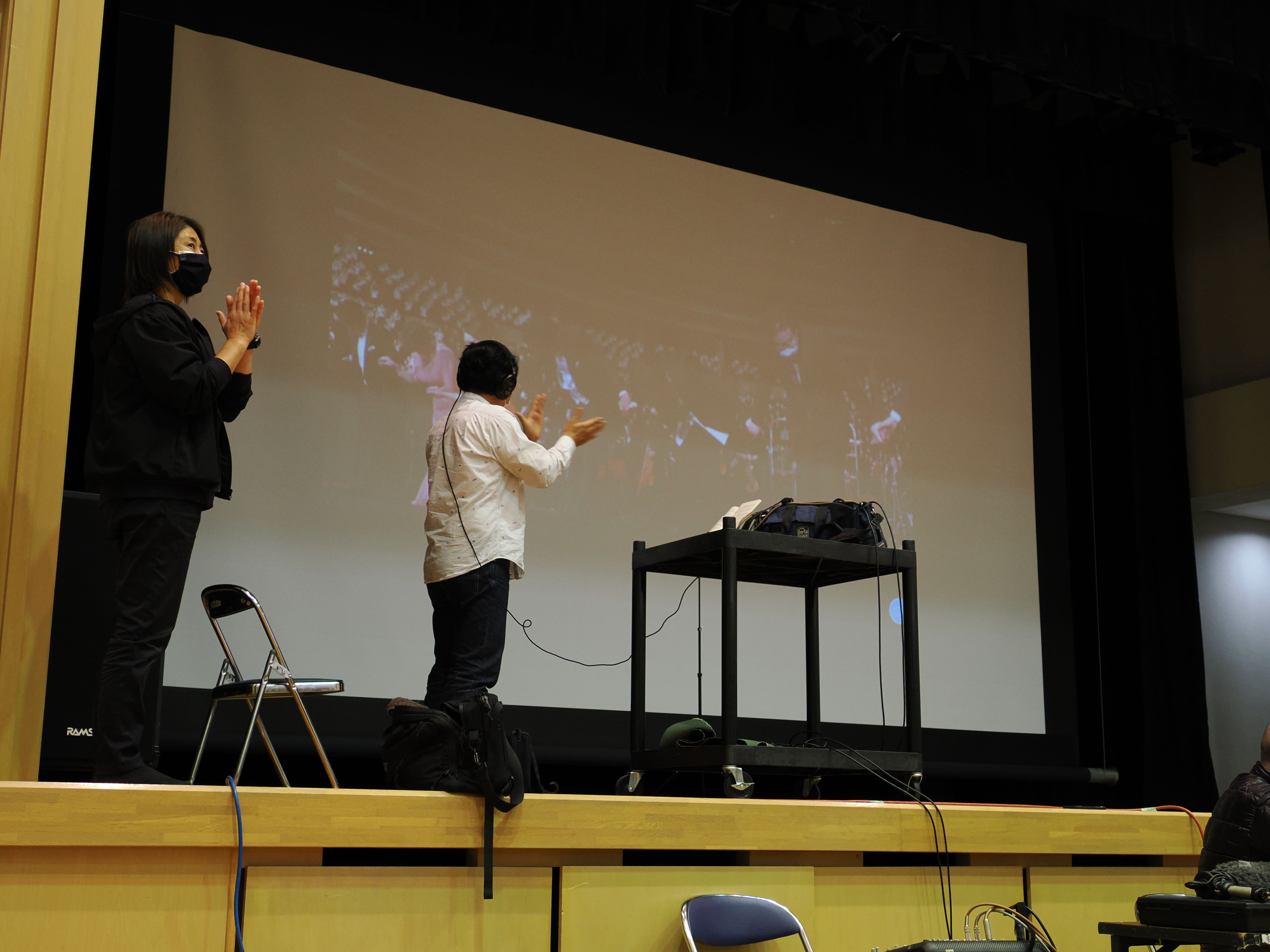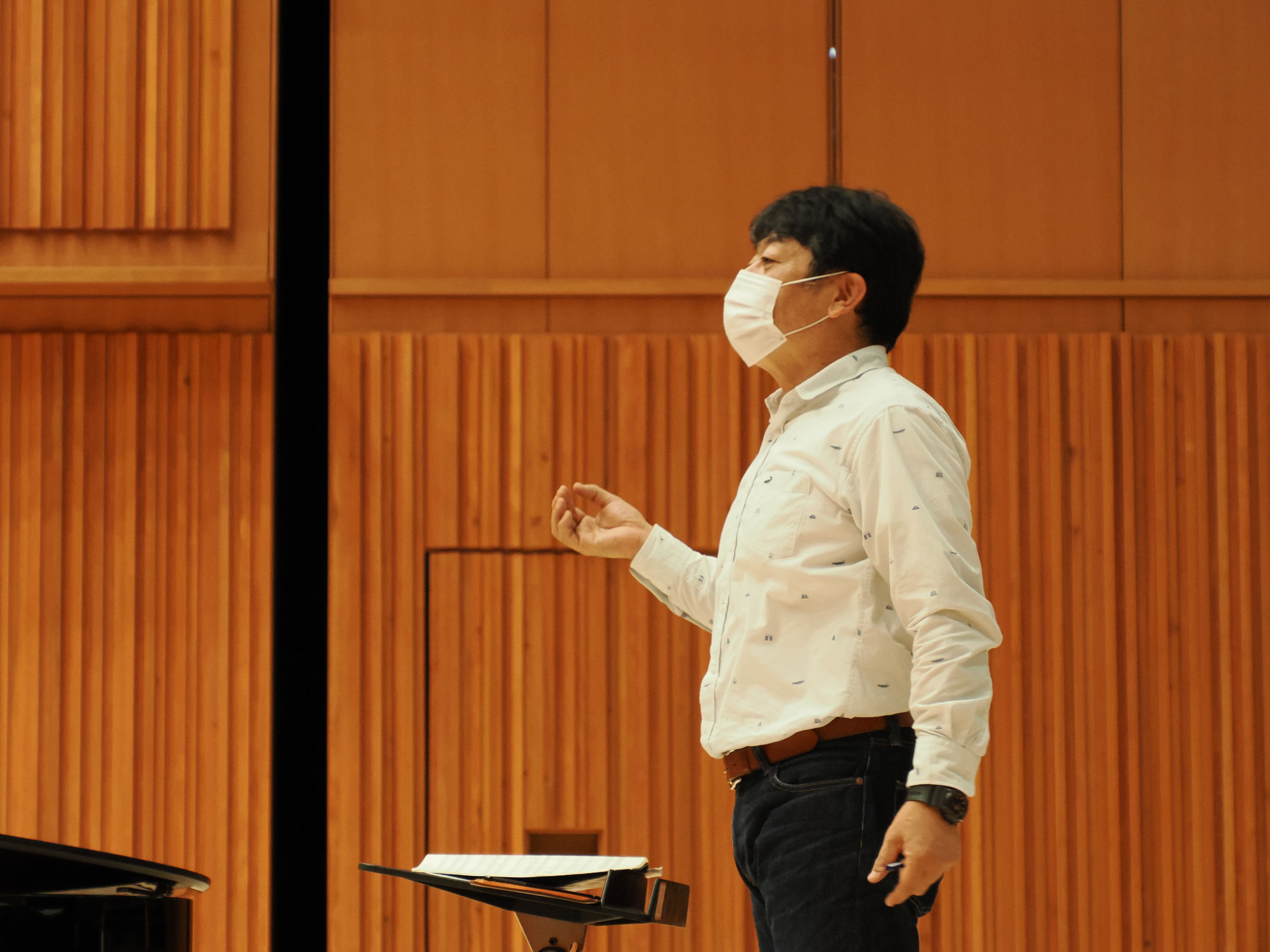 柳田先生の指揮は、団員の皆さんの目線がリモート収録のカメラに向くように舞台の上から。