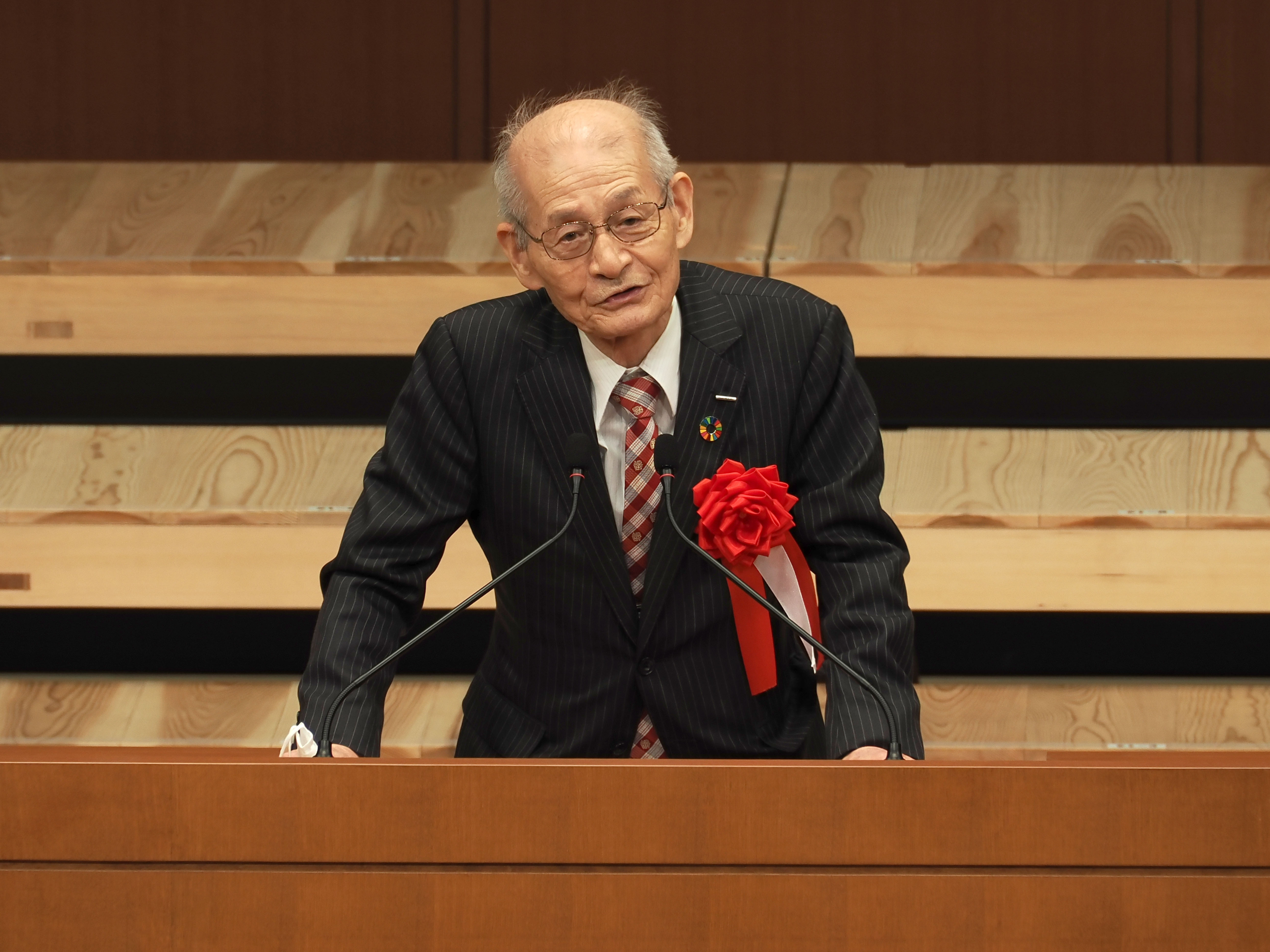 新しい記念館の建設の立案から設計、建設いろんな多くの方々がご尽力いただいたと思います。改めて御礼申し上げます。野口遵記念館名誉館長に就任にあたってひとこと、ご挨拶させていただきたいと思います。ひとことと申しましたが、二つ。