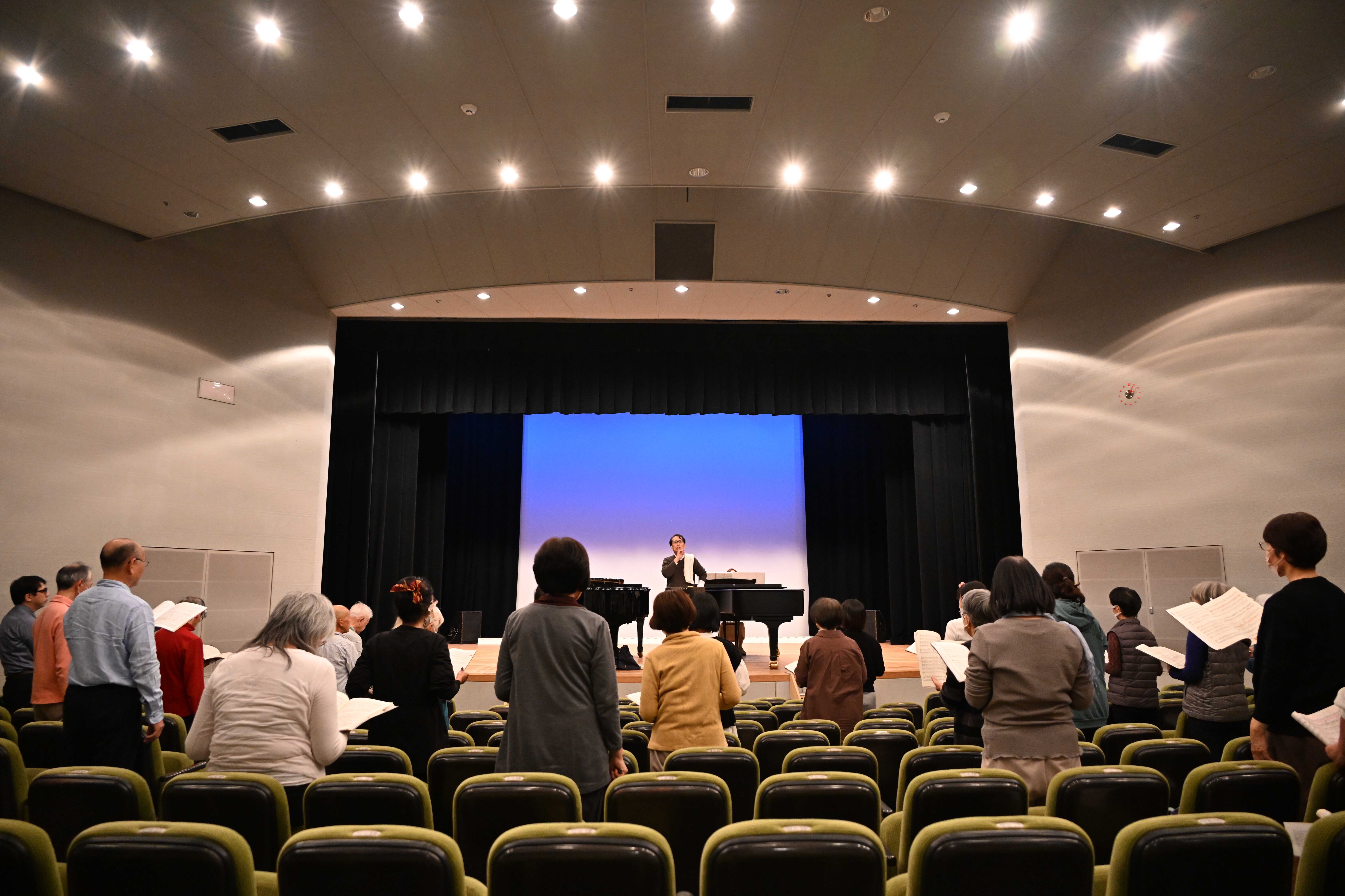 過去一番暖かい勤労感謝の日の練習でした。今日の小ホールの舞台上はピアノが2台準備されていました。
