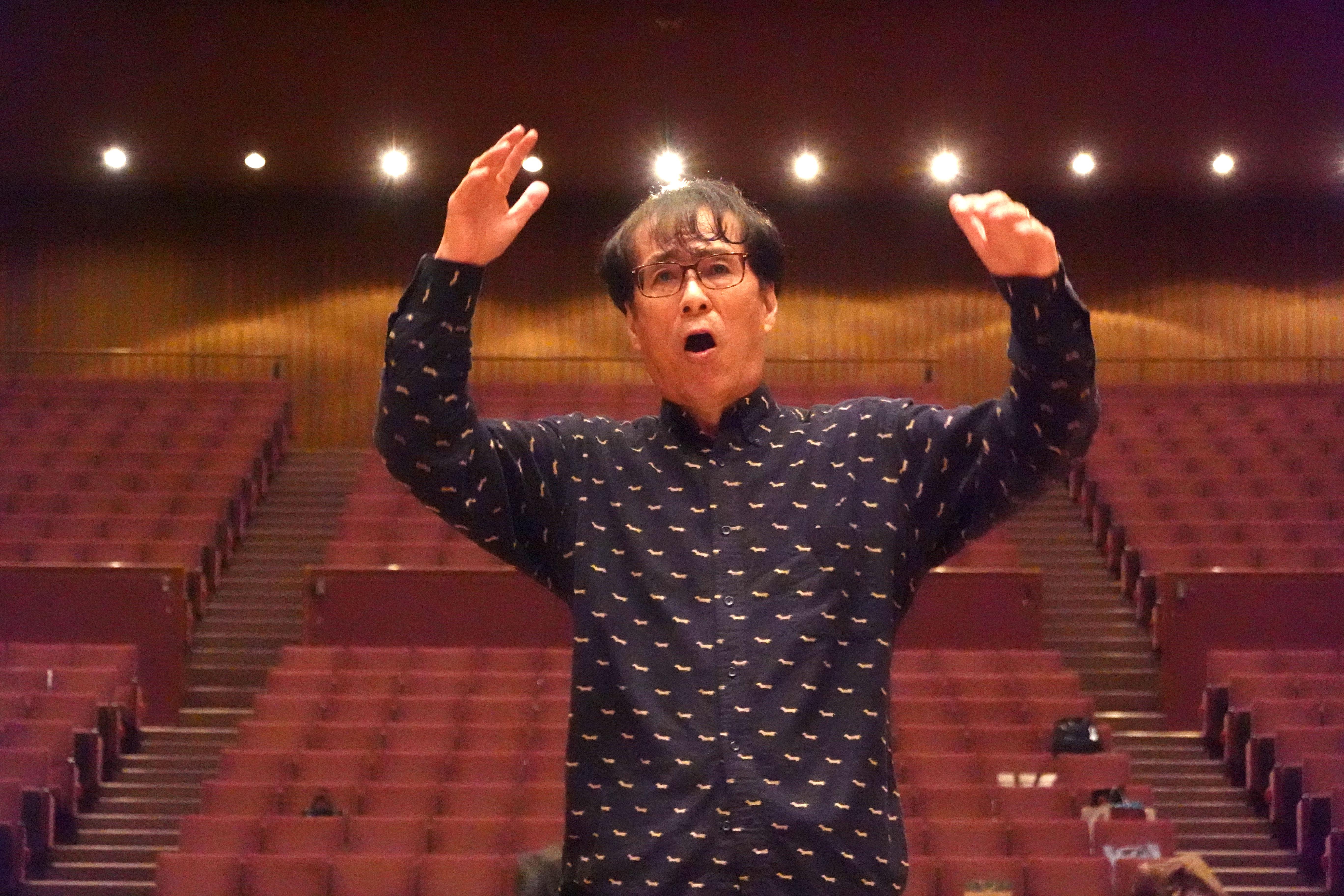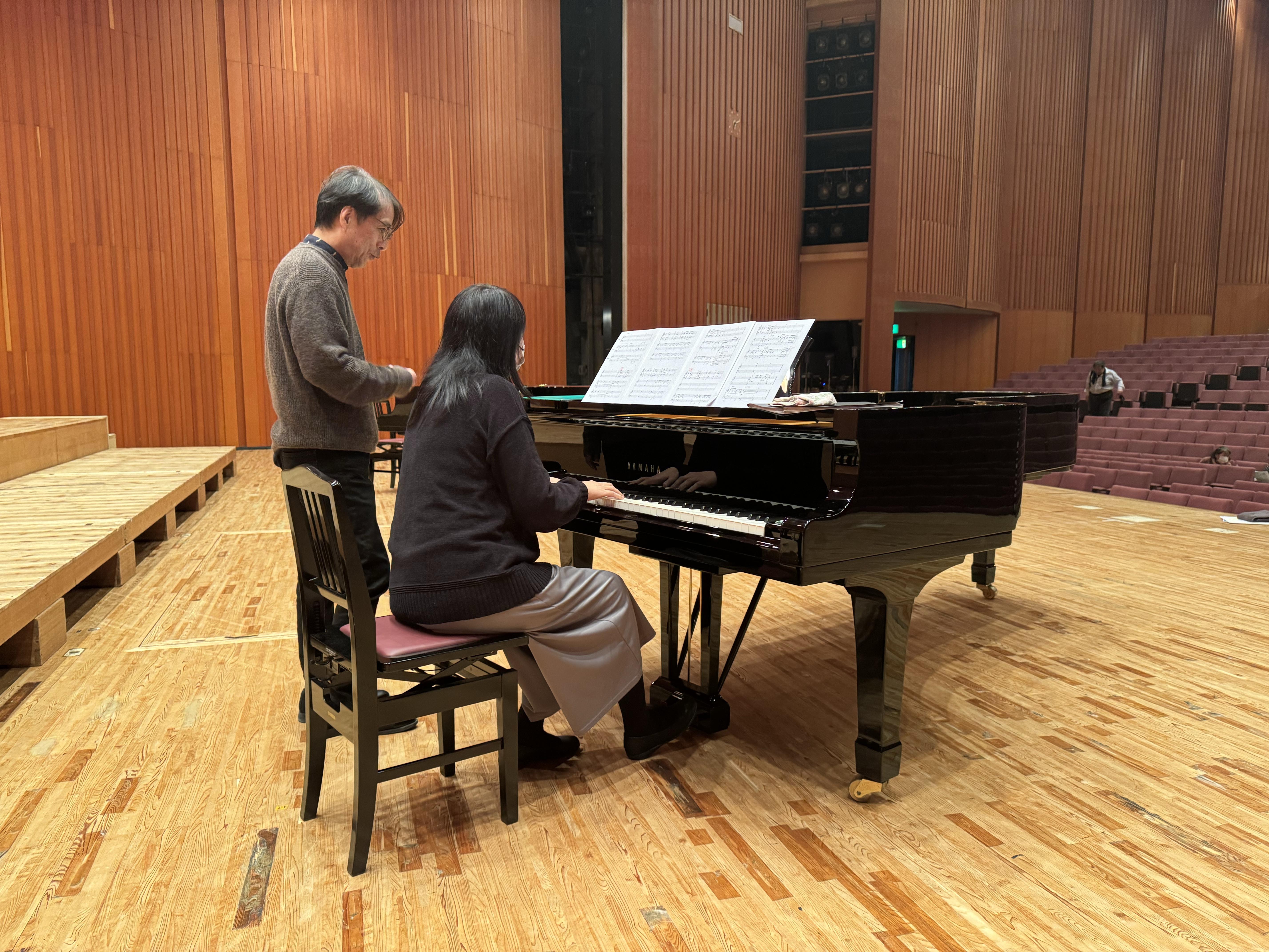 今日のピアノは大ホールの上に2台。公演のアンコールに予定している「聖夜」の伴奏、山本先生によるアレンジが加えられ、急遽、練習中です。