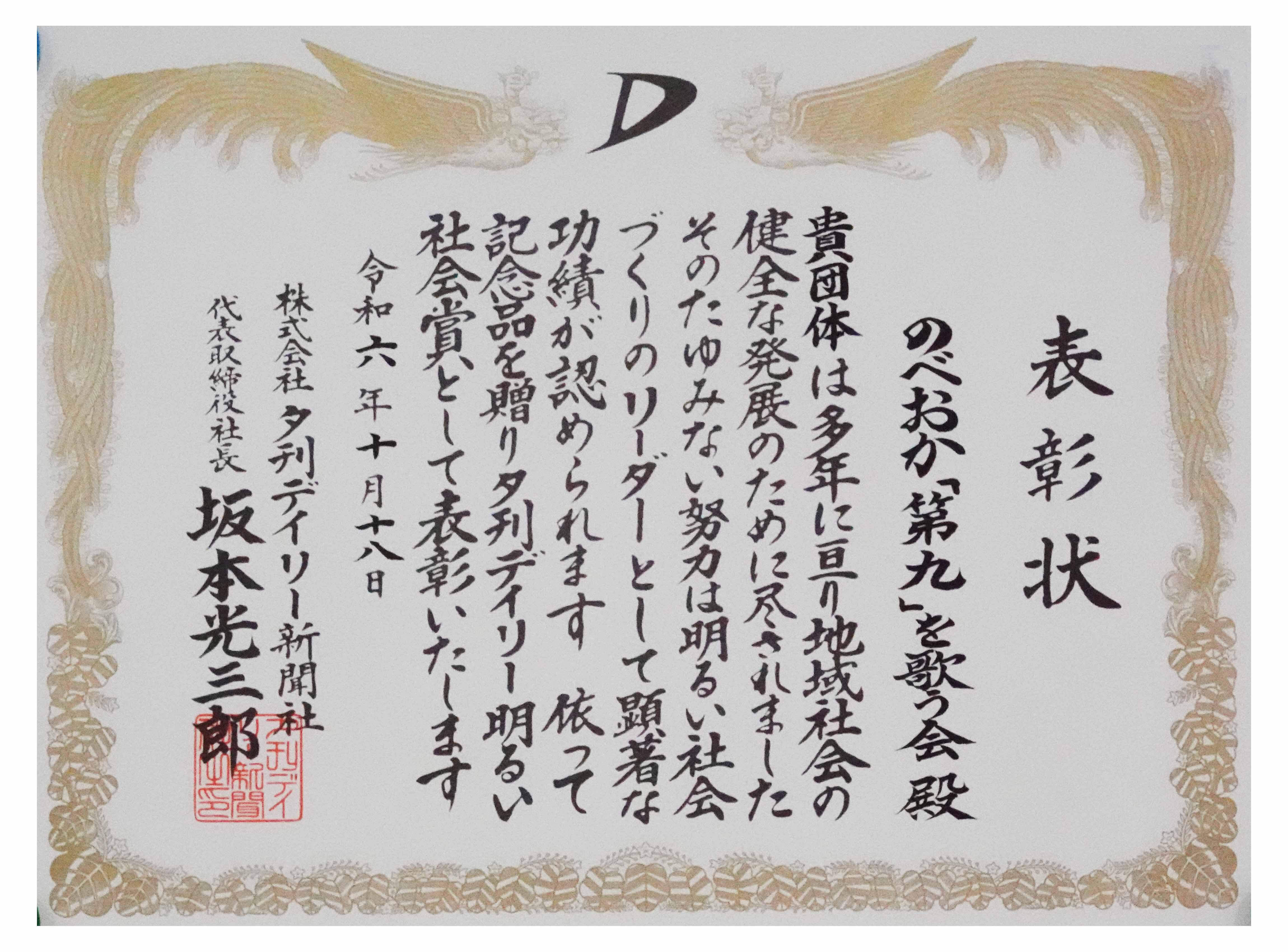 私たち、のべおか「第九」を歌う会は、このたび夕刊デイリー新聞社の「明るい社会賞」を受賞いたしました。(表彰状とトロフィーを受付に飾りました)