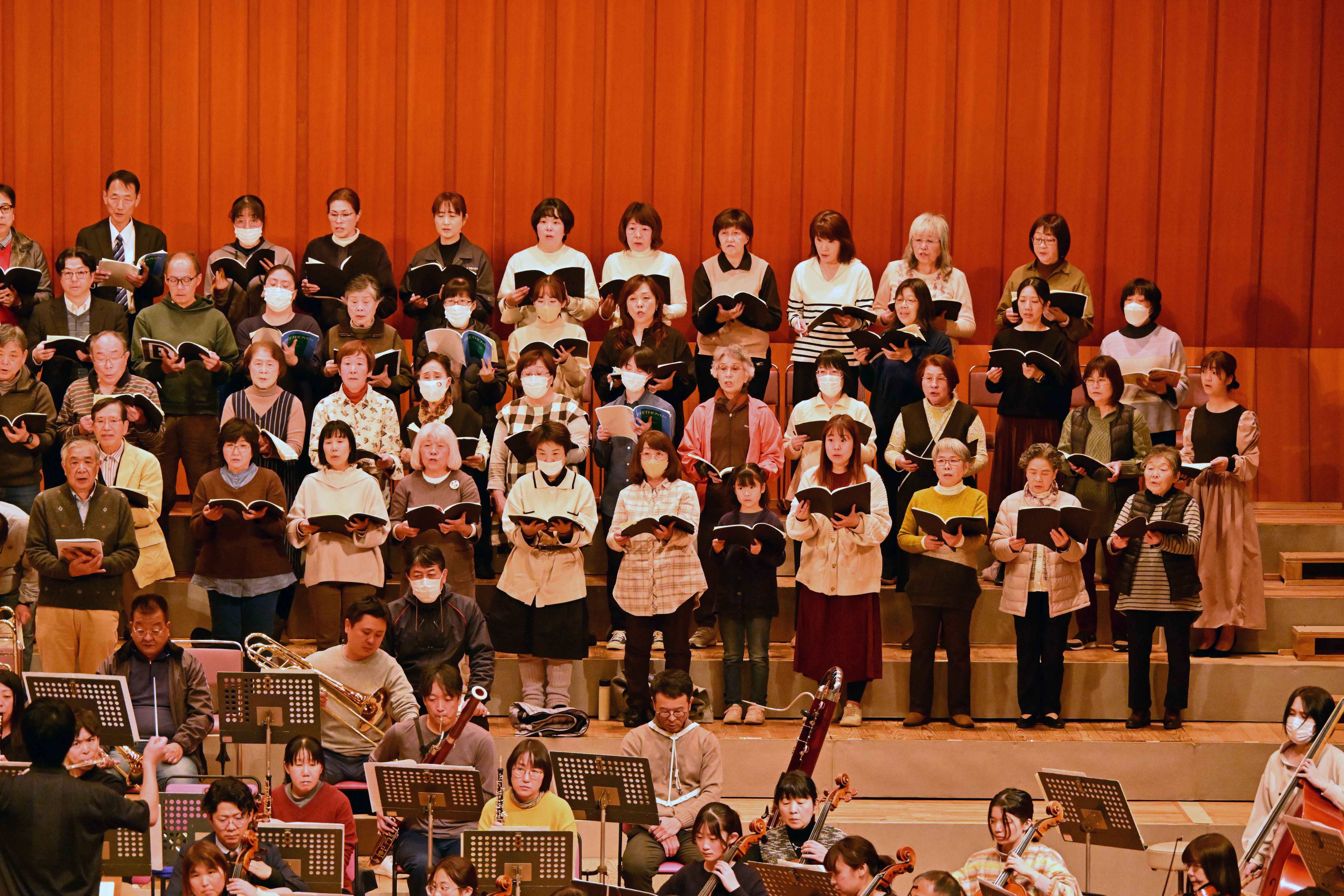 今日の練習は大ホールで延岡フィルハーモニーと合同で、本番さながらの内容となりました。早めに来てみると、舞台ひな壇の設営が始まっていました。