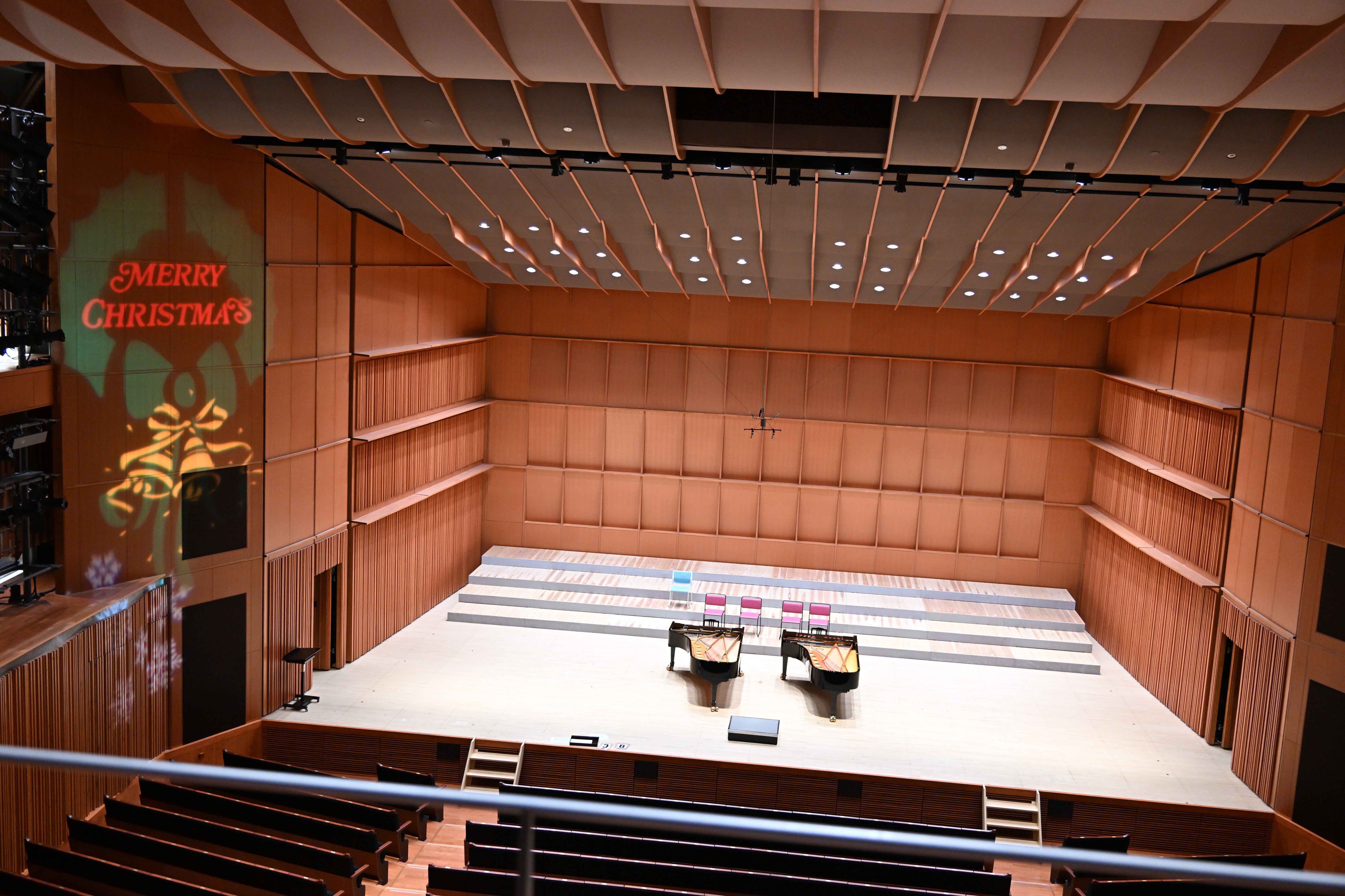 アンコール曲の「聖夜」のゲネプロの時には、客席の照明が落とされ、クリスマスの雰囲気を盛り立てる照明が壁面を照らします。