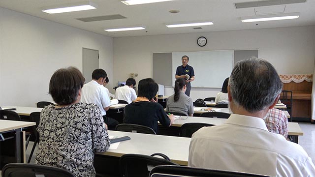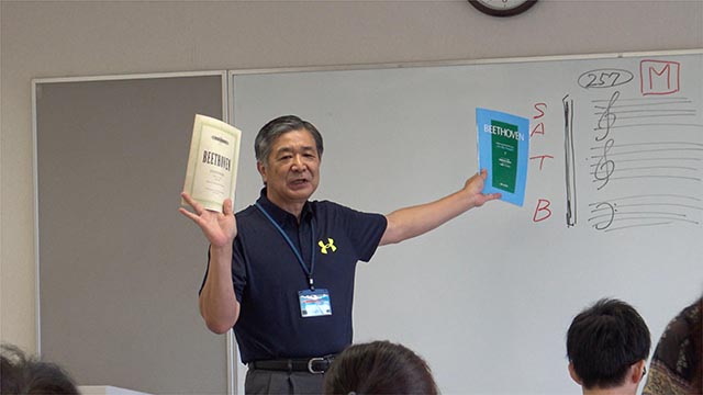 まず最初に渡邊さんが「第九」の練習は大きく4つに分けて練習することから、その準備としてタックインデックスの貼り方説明から始め、楽譜の読み方の説明を行いました。
