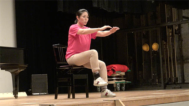 まず柳田さんの柔軟体操ですが、新たな運動として前の椅子の背持たせに手を置いて膝を上げる運動…