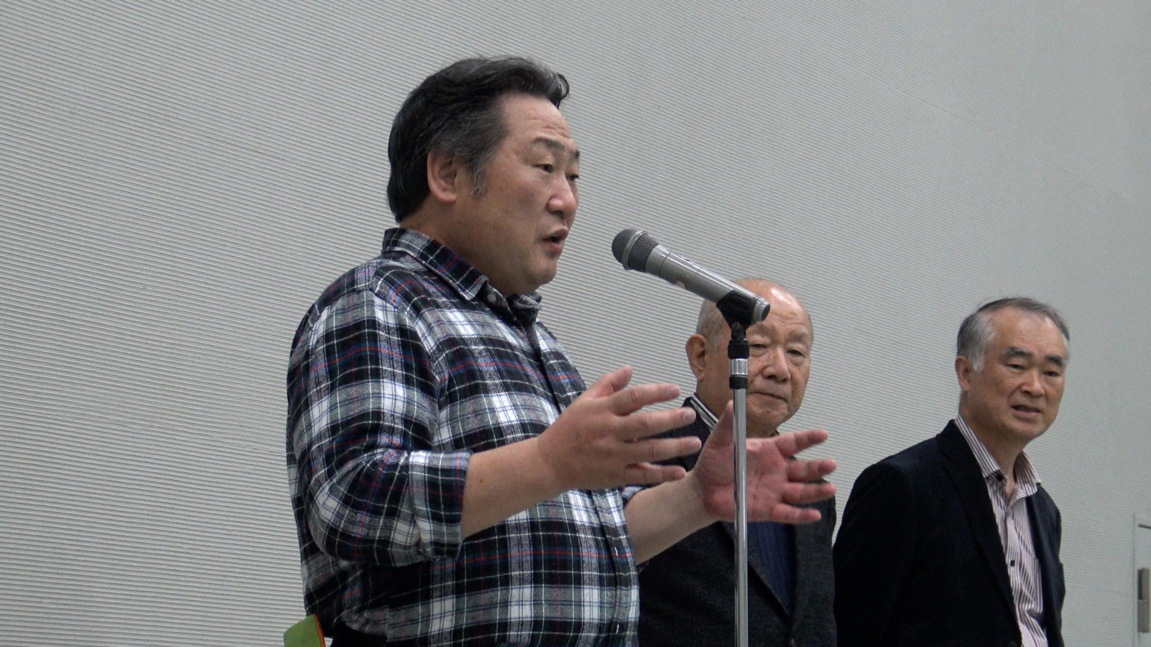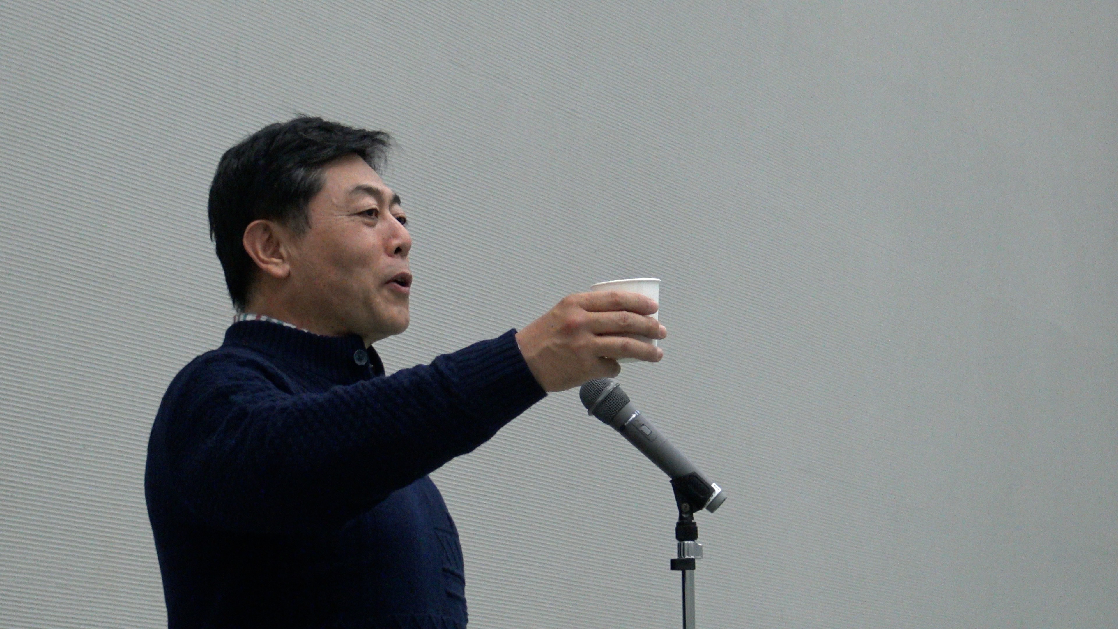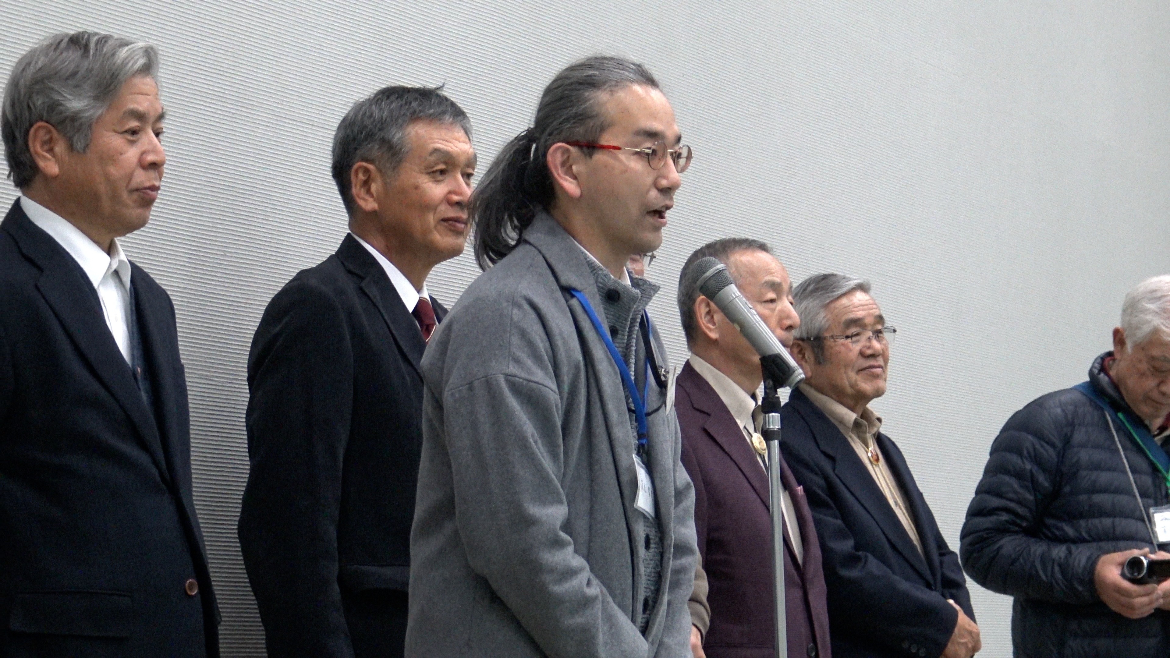 展示室に移動して打ち上げです。まず今村会長からのごあいさつです。