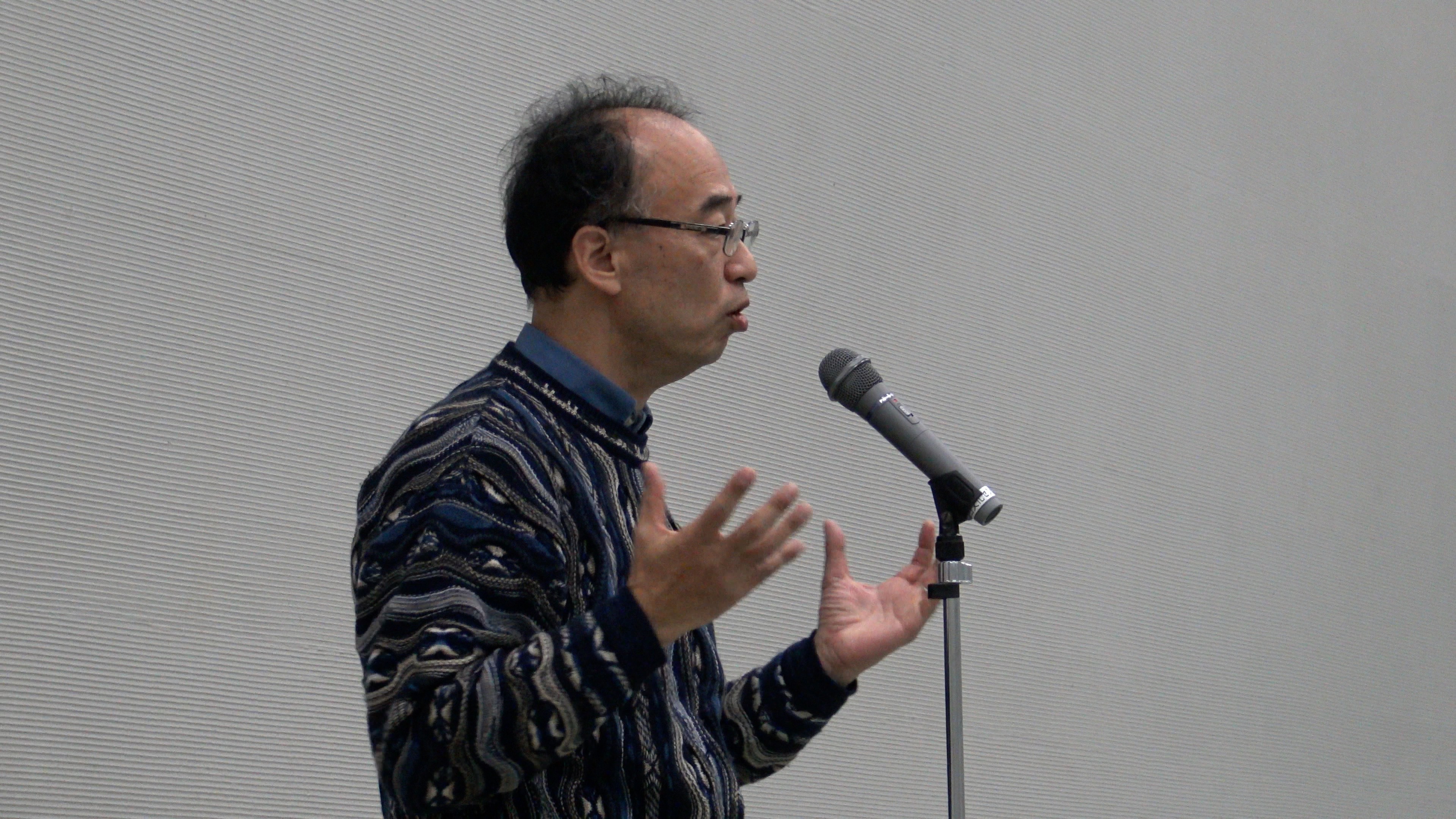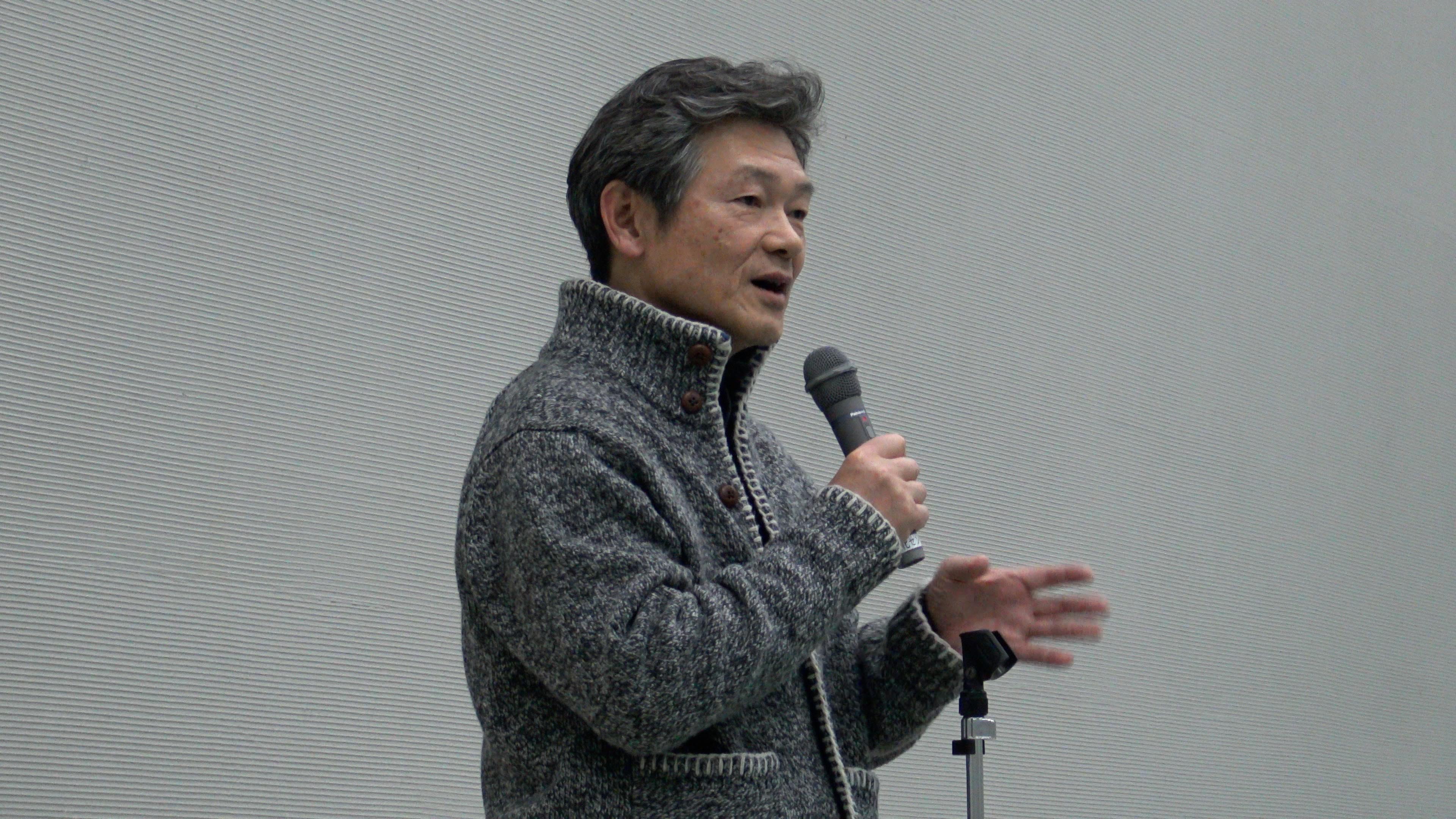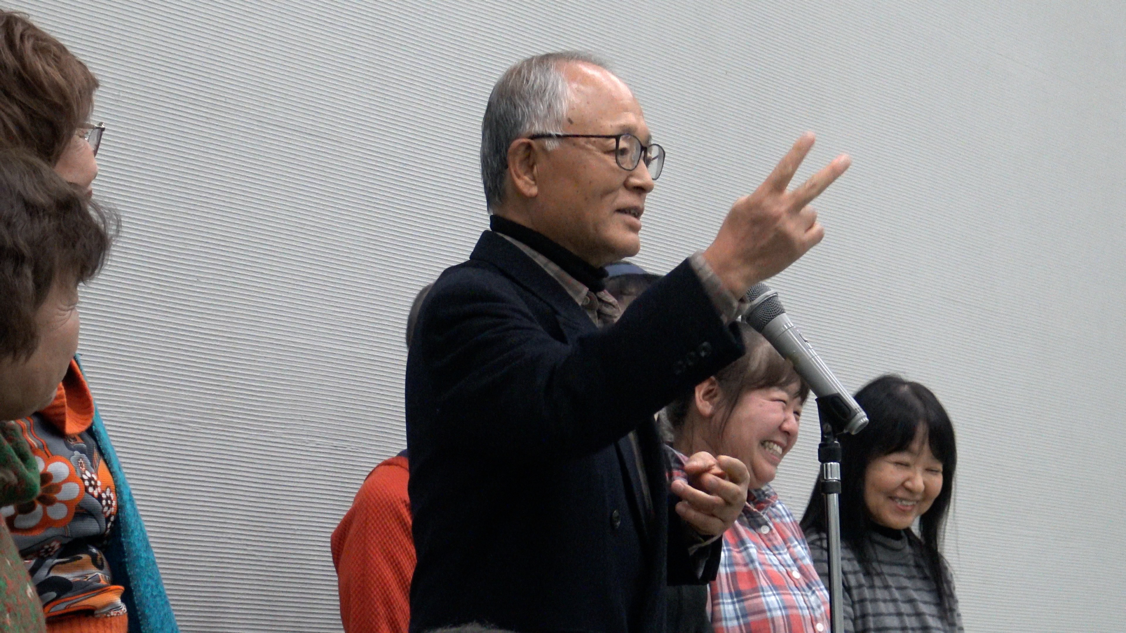 展示室に移動して打ち上げです。まず今村会長からのごあいさつです。