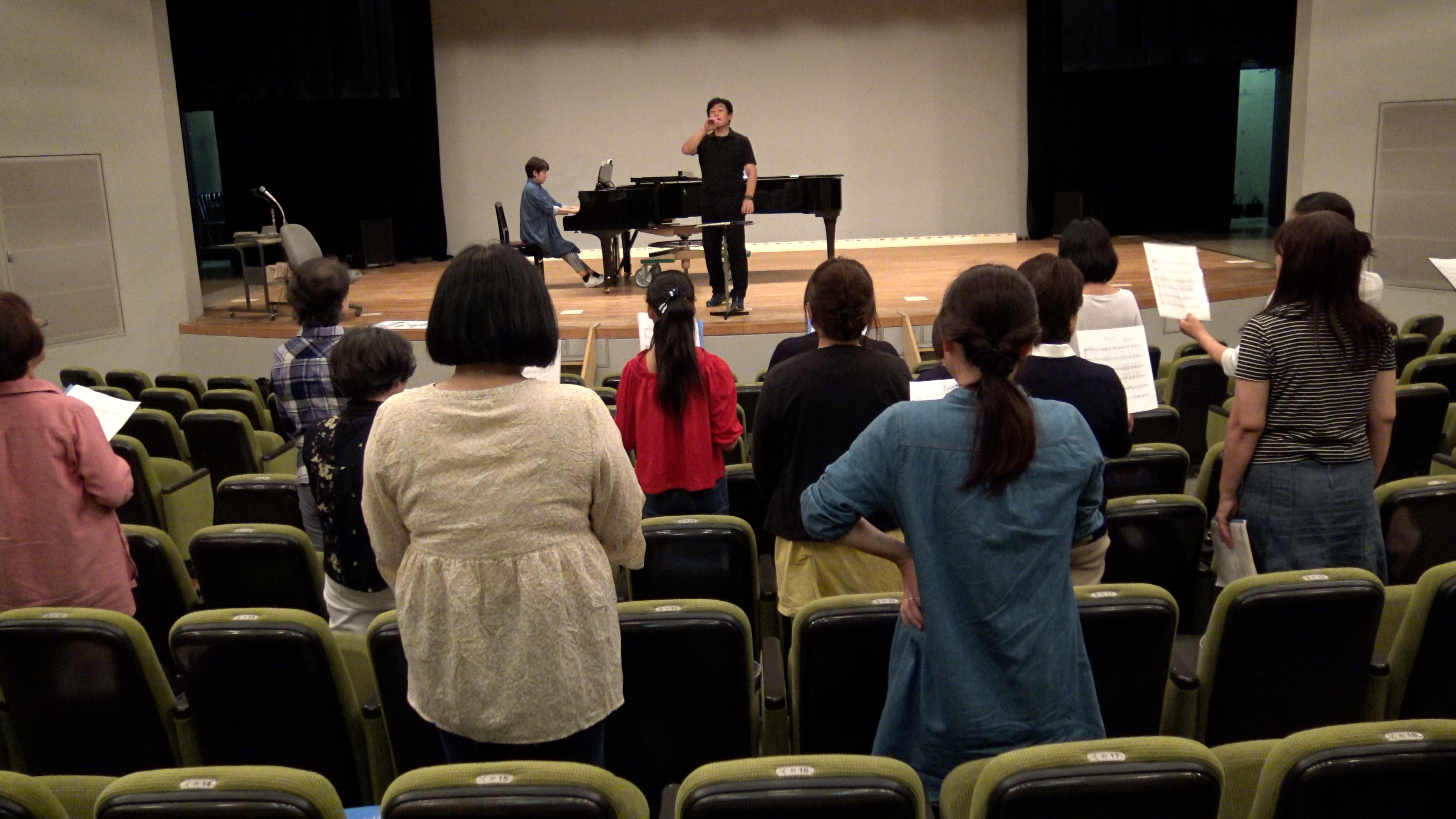 いつもの柳田先生の発声練習、どこに息を送り込むイメージなのか、息を飲むときに音を出さない!? 声を送り出すときは喉を開きます。