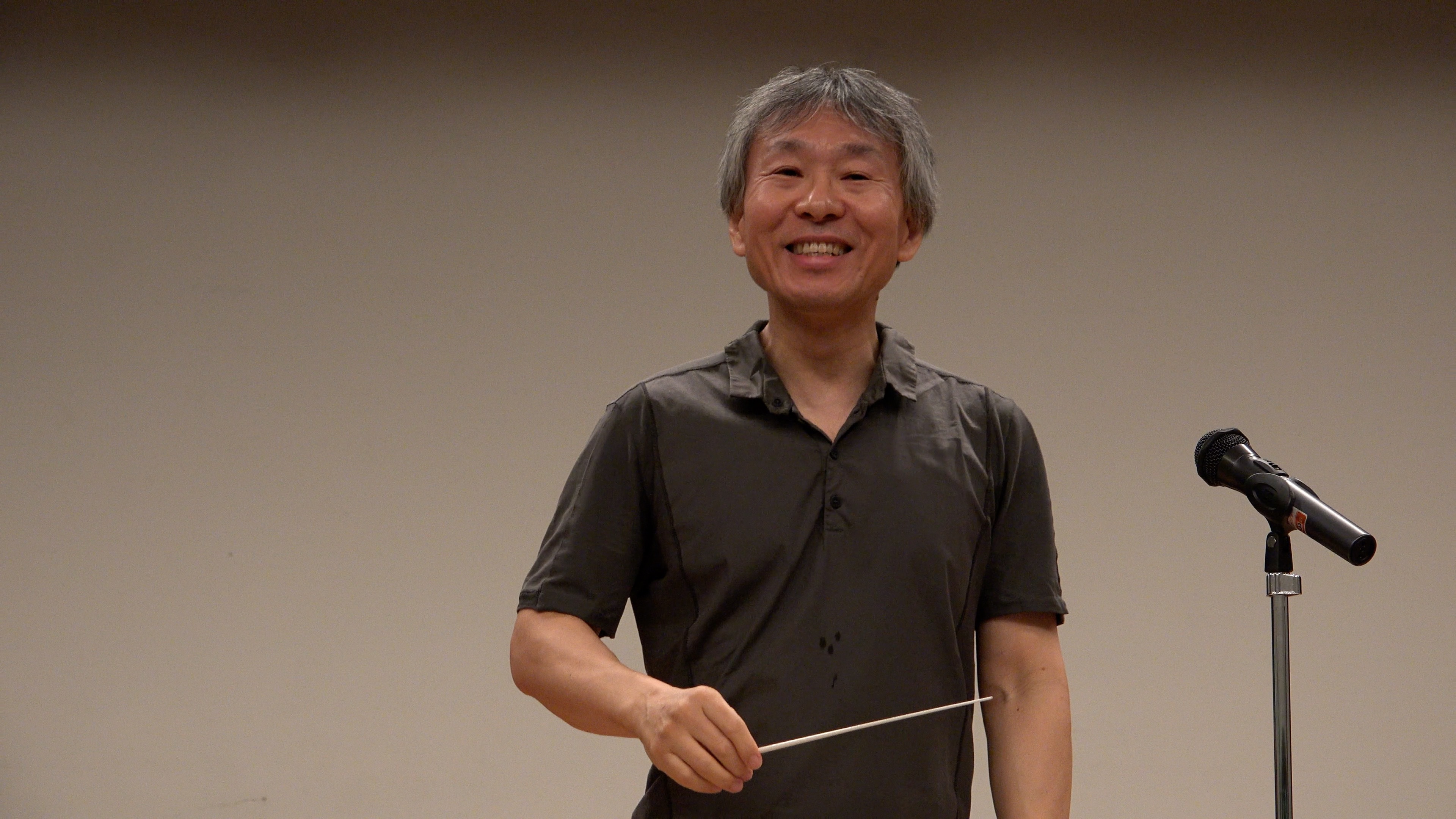 (ひととおりMの部分から歌った後で)昨日、大分で初めて練習しました。今日はセットでいつものように延岡に伺おうとお話ししたところ、まだ早いと。できてない。できてなくて結構。それで申し上げたのはみなさんが出来上がったときには、皆さんが解釈したテンポであり語尾の長さであり、様々な今まで歴史を紡いできた分だけのいろんなものが積み上がってるわけですよね。それを、いち早く私がこういうふうに考えますよということをお伝えするのが最優先です。それから練習されたらいいのです。出来ましたと言って12月に伺ったら、みなさんがやってらしたことと僕の違いを一生懸命直そう直そう、修正しようとか変えようとかということにエネルギー使ってるうちに本番が過ぎてしまうということがよくあるんです。なので、皆さんが10月にどのくらいかはまぁ今コメントしませんが(笑)案の定いろんなことがありますので、それをまず確認いただきたい。Mのところ、速いです僕。ということは自ずと男性のマーチも速いです。