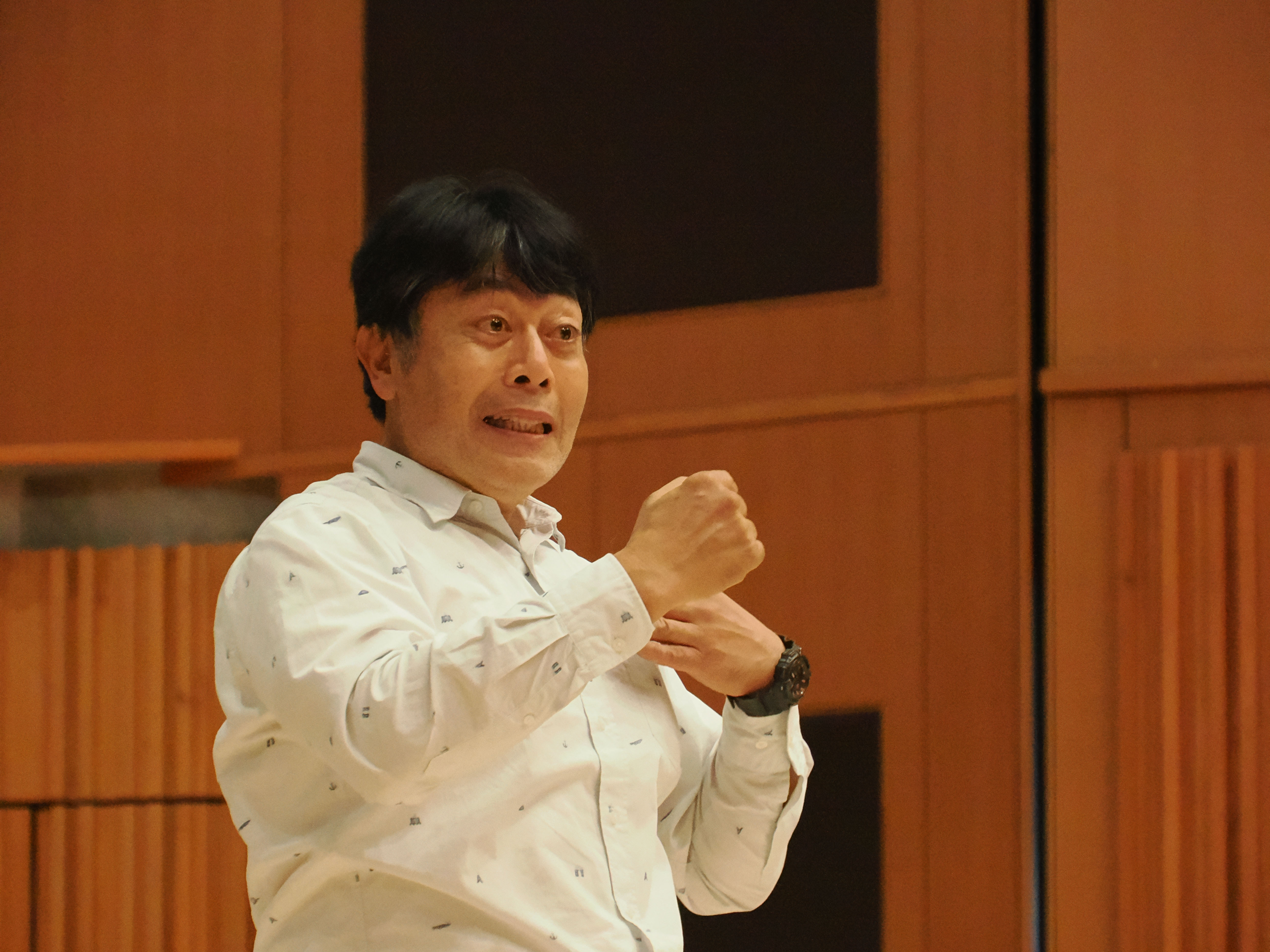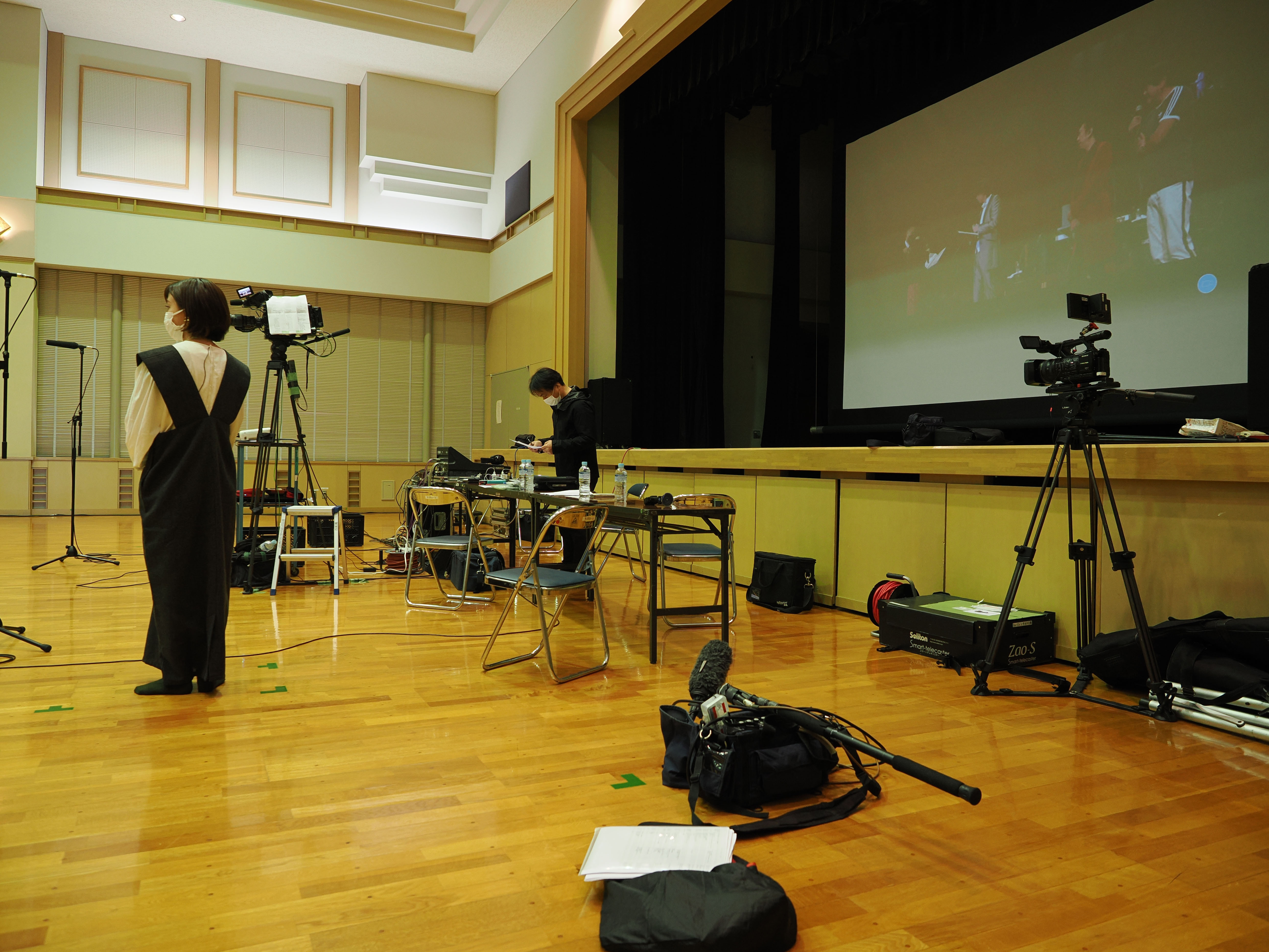 柳田先生の指揮は、団員の皆さんの目線がリモート収録のカメラに向くように舞台の上から。