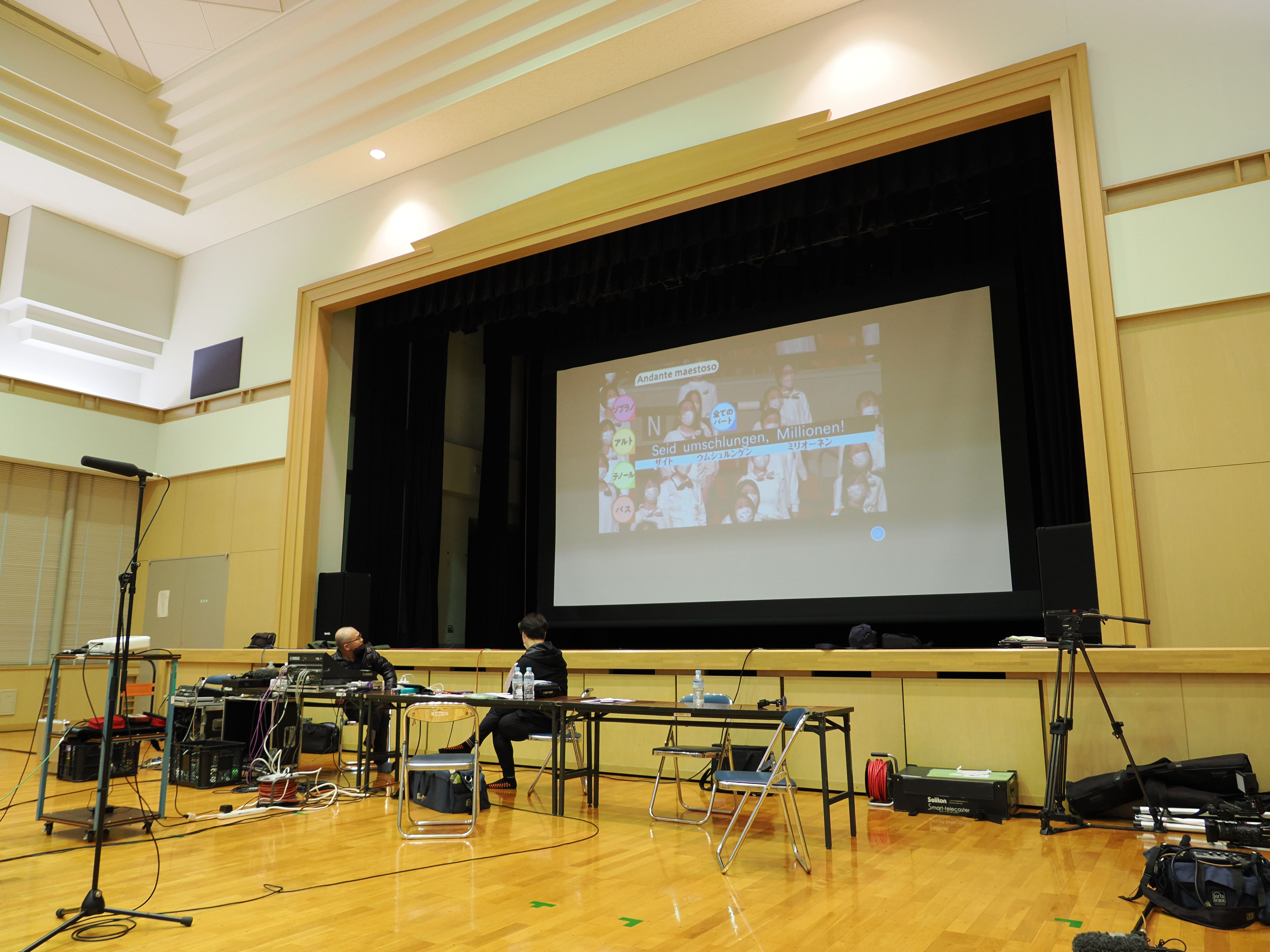 舞台のスクリーンに大阪城ホールでリハーサル中の1万人の第九が投影され、歌詞がカラオケのように重ねて出てきて、それに合わせて歌うことに。