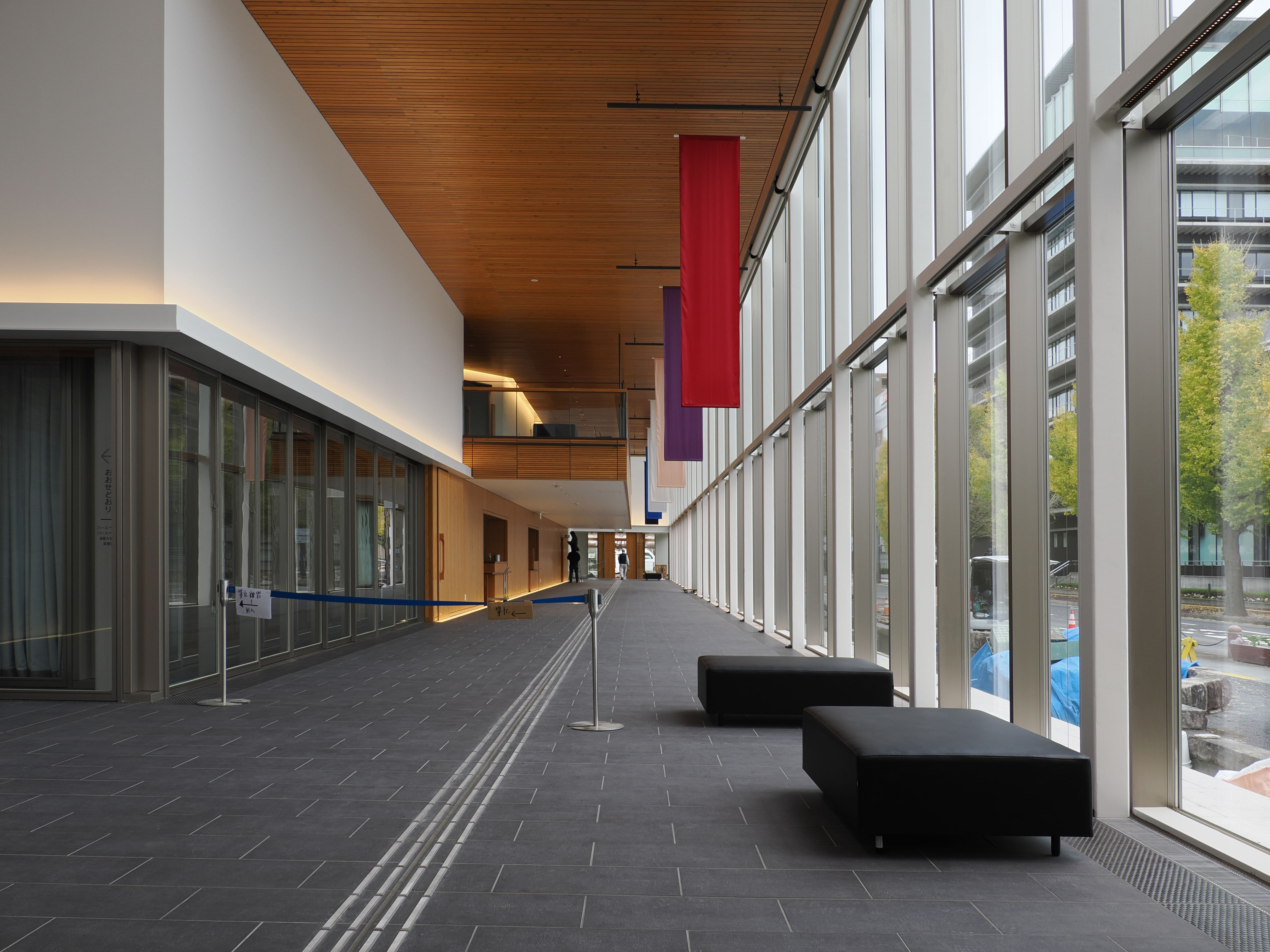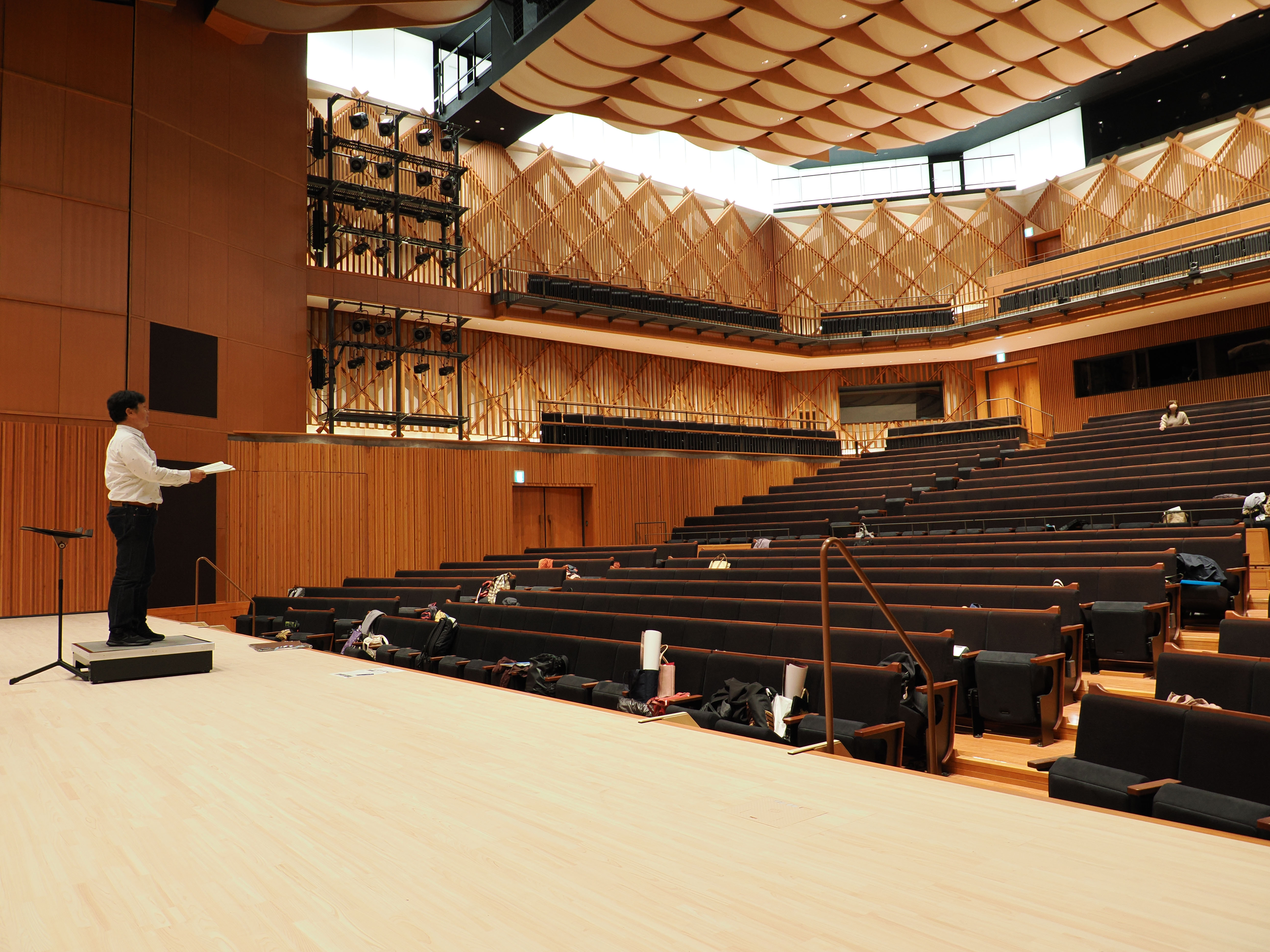 ホール内は木の香りが漂い、客席はご覧の通り。我々は、まだ誰も踏み入れていない檜舞台に足を踏み入る最初の来訪者となりました。