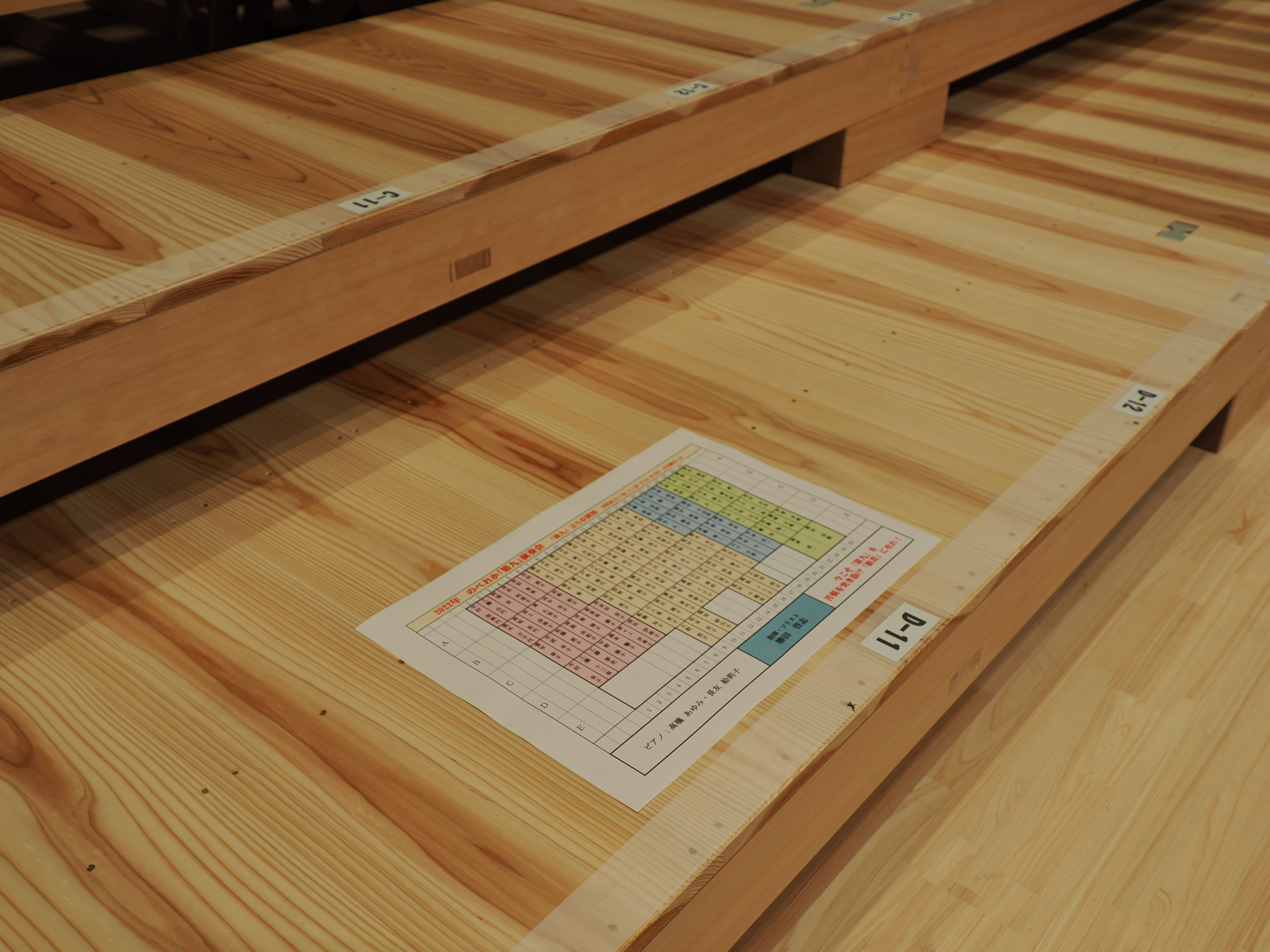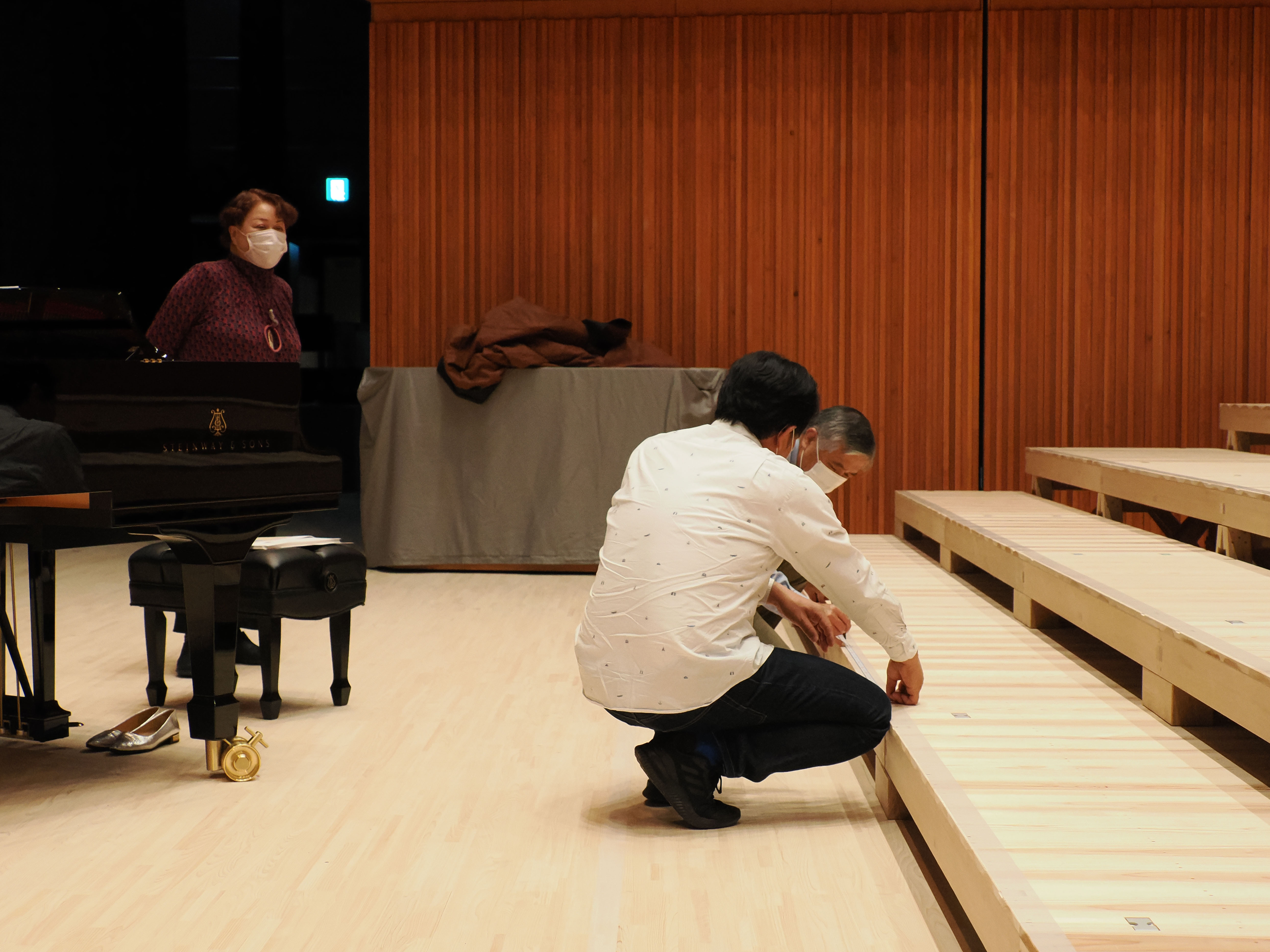 舞台にはひな壇が組まれ、団員の立ち位置のマーキング作業です。