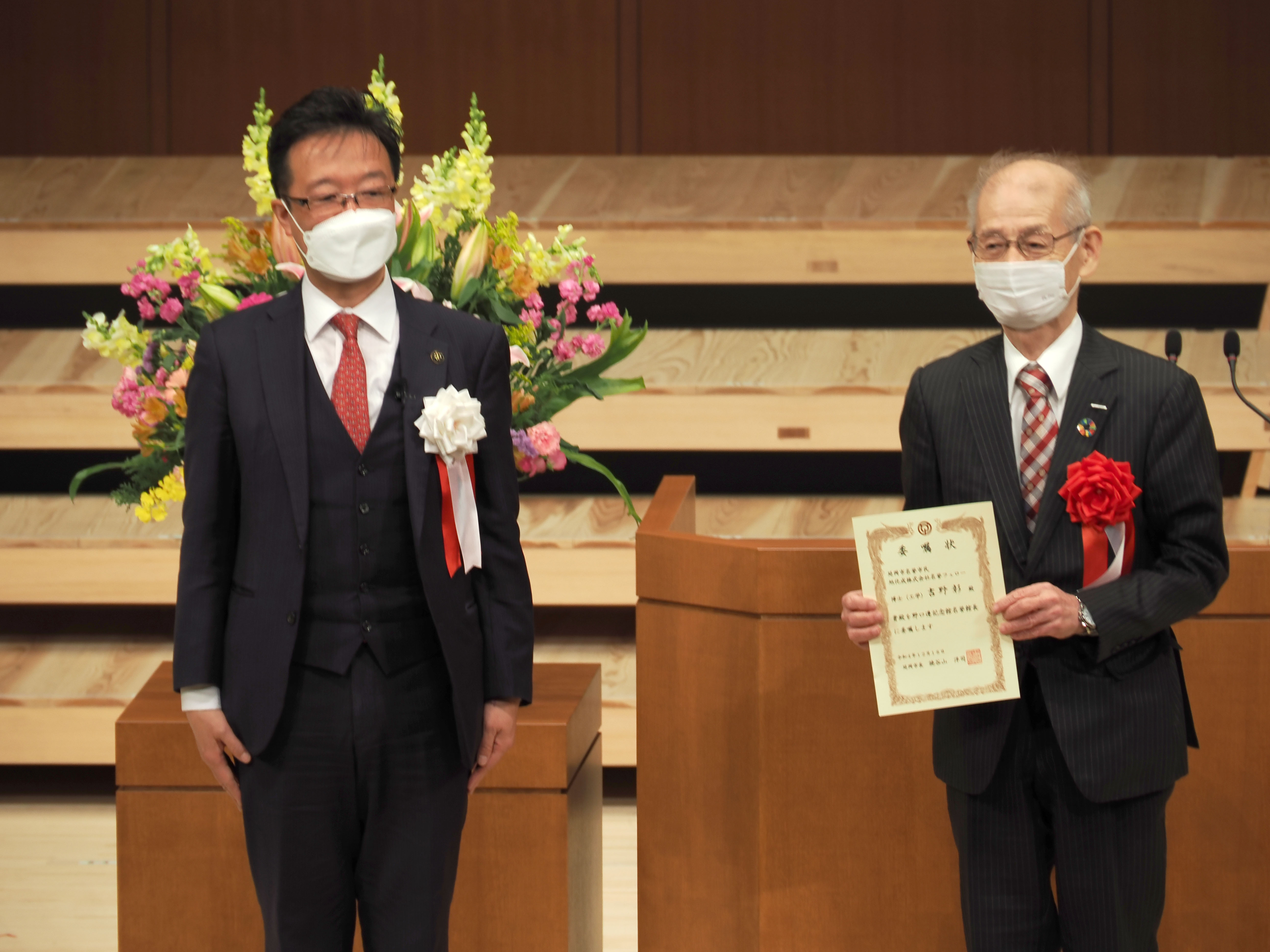 式典の中で、この日にご来賓の延岡市の名誉市民で旭化成株式会社名誉フェローの吉野彰氏に、市長から野口遵記念館の名誉館長の委嘱状の交付が行われました。
