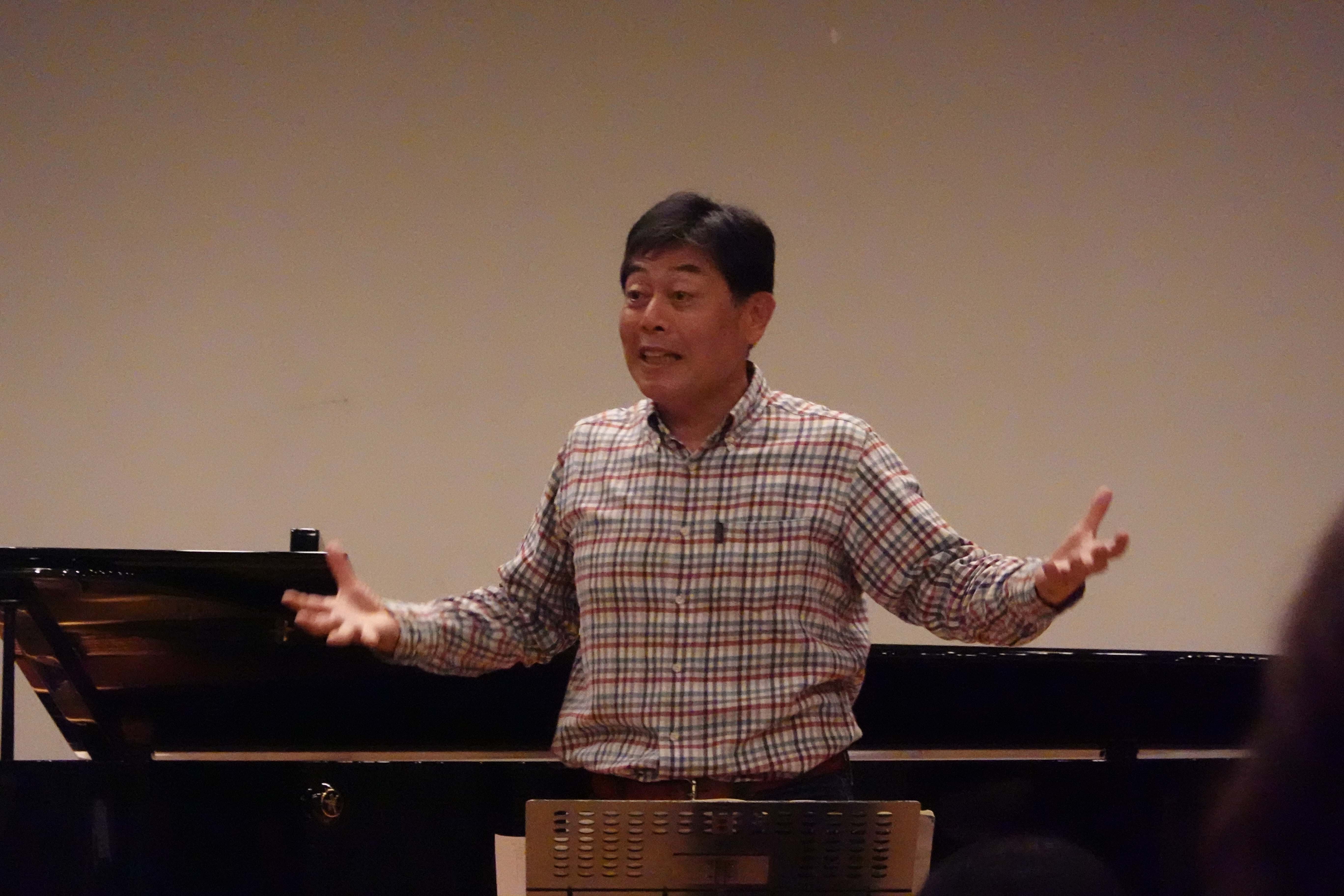 いつもの柔軟体操から練習開始。今日は公演当日のアンコールで歌われる「聖夜」の楽譜が配布されました。