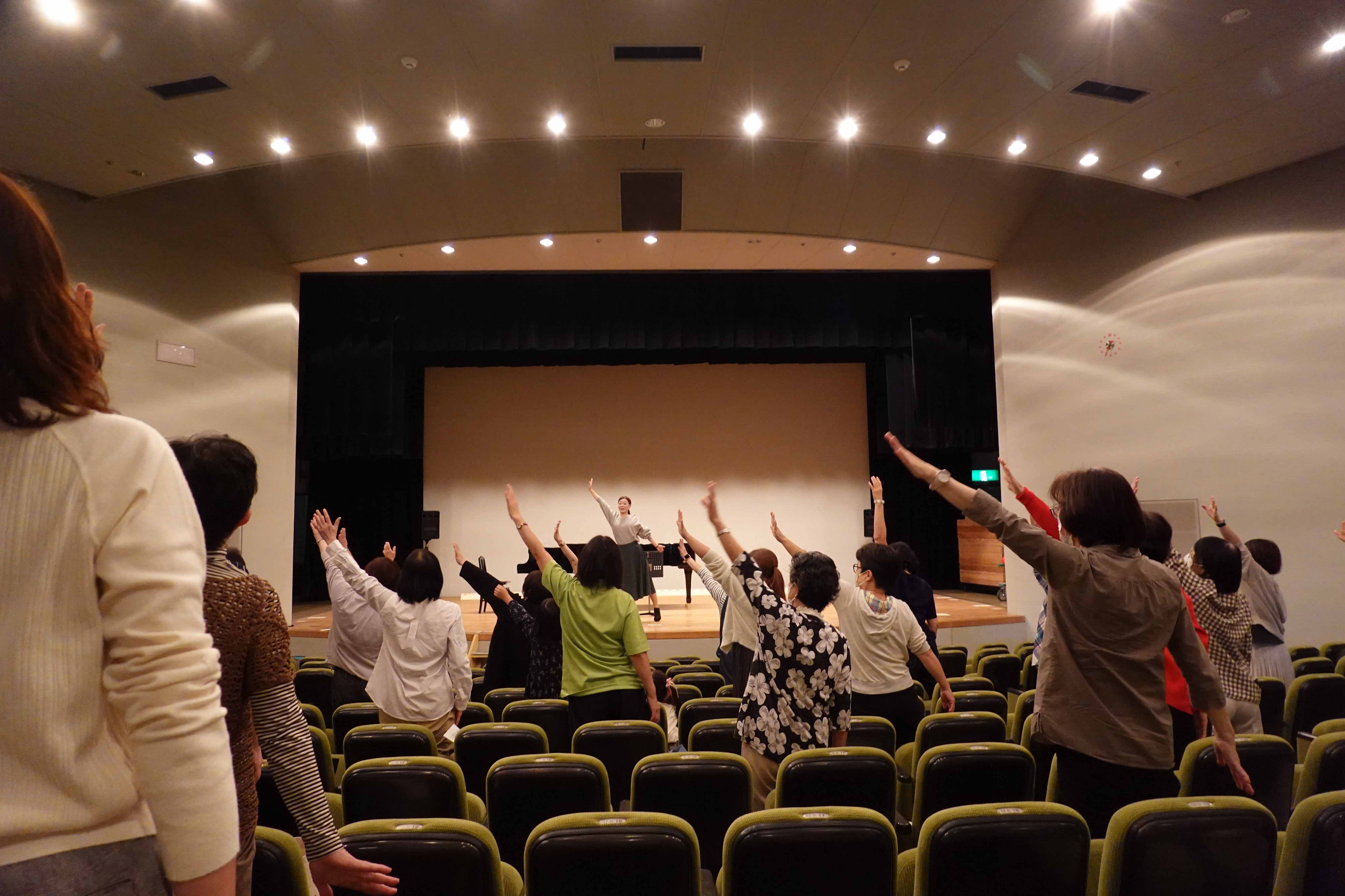 さて、今日からパート練習がありません。すべて小ホールでの練習となりました。まず、米良先生の柔軟体操からスタート。